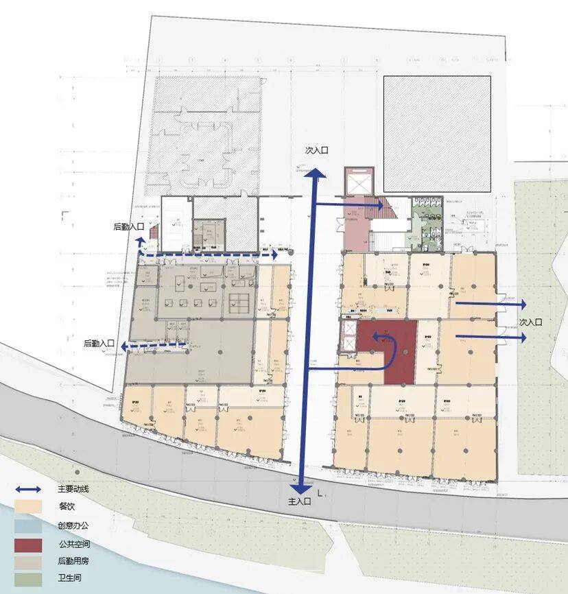 因使用年限较久且使用方更迭频繁,光复路195号的室内外存在较大规模的改造,保存状况不一。外立面存在多处门窗改动、搭建加建,室内普遍存在后期加建的隔墙、夹层等。经过历史原始布局研读和功能策划排布,建筑底层空间以餐饮、公共、设备功能为主,主要流线为从光复路至中央通廊“光路”的流线,东侧局部打开封闭界面,向双拥公园展示更积极的空间渗透。