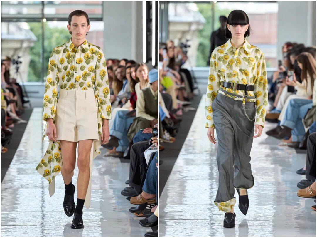 衬衫元素在干练中以落肩的设计多了几分休闲的随性感,在浅色调的白色和黄色、绿色等颜色之间的搭配中,色彩的对比带来了更为强烈的撞色冲击,在这些色彩的对比则多了碎花图案的清新活力,为衬衫增加了一些艺术感。