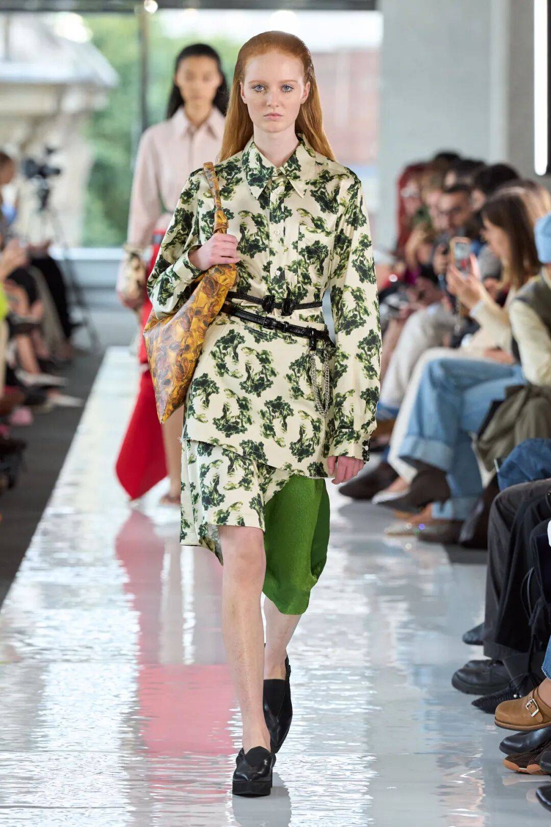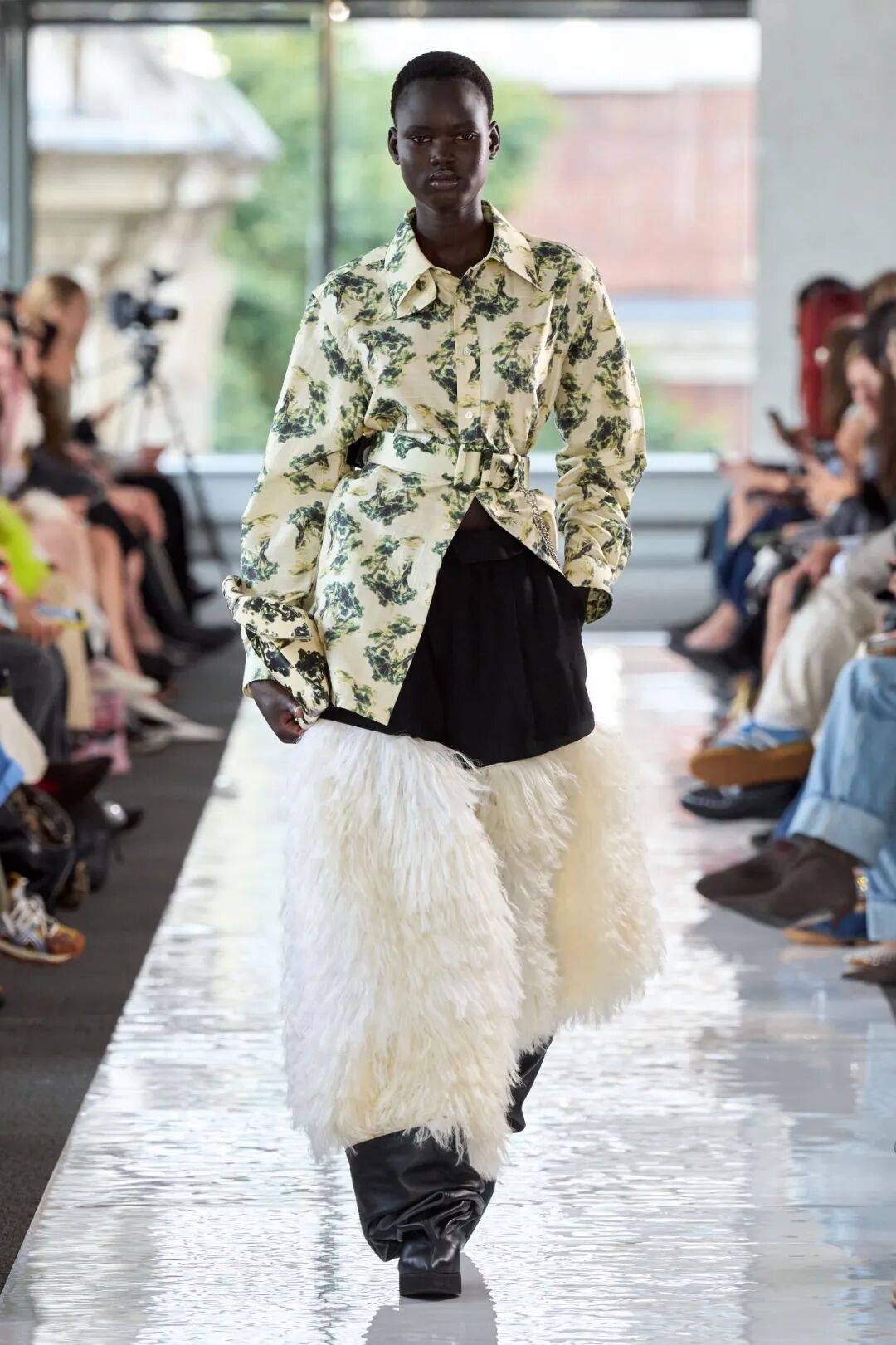 花纹图案的上衣在一些绿色系的花纹装饰之中,增加了碎花图案的活力和清新的气质,在腰带的装饰也多了一些修身收腰的细节感,而在搭配的下装中,经典黑白的百搭,也在毛绒元素之上多了廓形感。