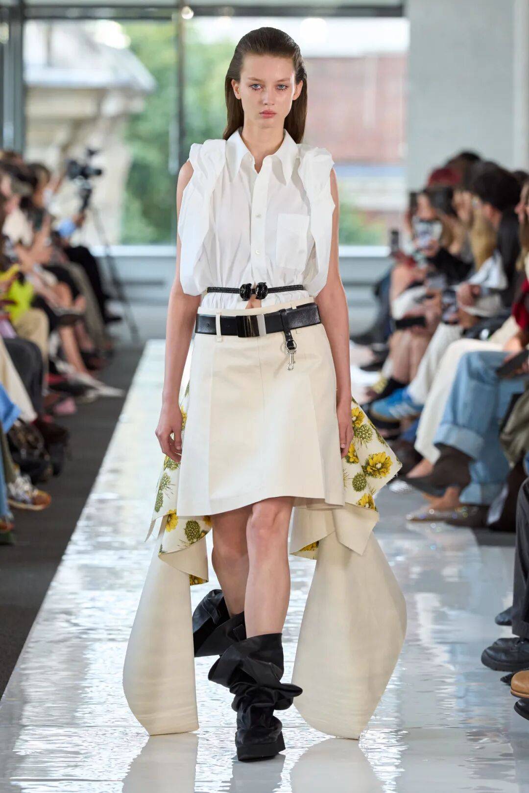 浅色的上衣穿搭中,白色衬衫的利落,米白色外套的廓形休闲等设计在色彩的轻微对比中多了一些层次感,而在和黑色皮裙的搭配更多了撞色冲击,结合不规则的下摆线条,也多了一些细节的造型。