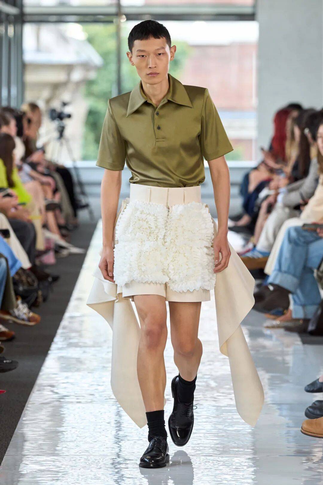 立体褶皱:衬衫袖子切开卷起形成肩部戏剧性效果
