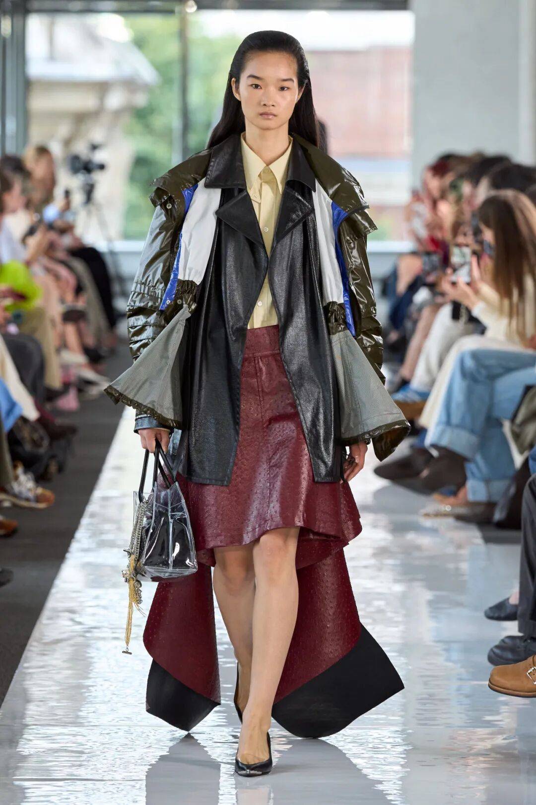 光泽皮革的休闲上衣,在色彩的对比和质感的差异之中让服装的层次更为鲜明丰富,而搭配的枣红色的皮裙,也在色彩的高级中,结合造型更多了一些细节的廓形时尚。