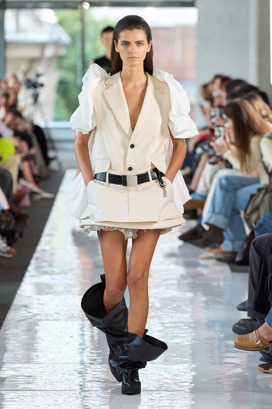 浅色颜色的服装结合几分西服元素的干练廓形的时尚,而袖子位置的夸张造型也有着一些特色的造型张力感;以黑色堆叠的靴子搭配,带着随性的休闲日常。