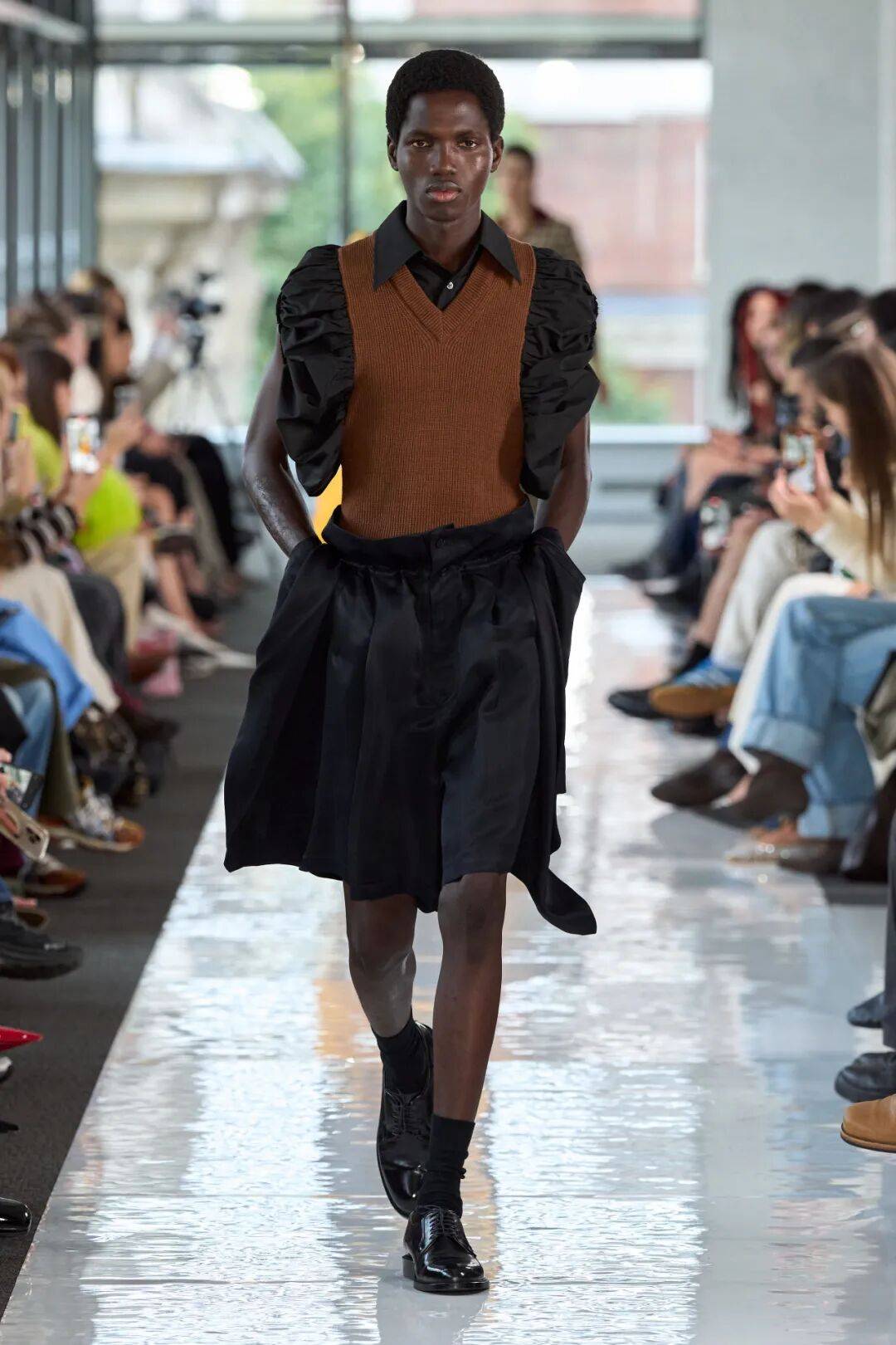 黑色和棕色的色彩搭配,在这些低调的中性色彩之中,以色彩的对比带来撞色冲击,还在拼接的设计上也有着一些视觉差异,在褶皱元素的蓬松造型等设计也多了细节的设计感。