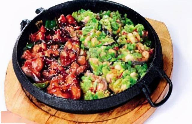 3、锅留底油,放入小米辣碎、蒜泥、辣椒酱、辣椒酱、海鲜酱、排骨酱、豆瓣酱炒香,掺少许鲜汤并下入茄丁和猪五花肉粒,稍煮后用湿淀粉勾薄芡,并调入鸡精和味精,出锅装在垫有洋葱丝的滚烫铁板上。