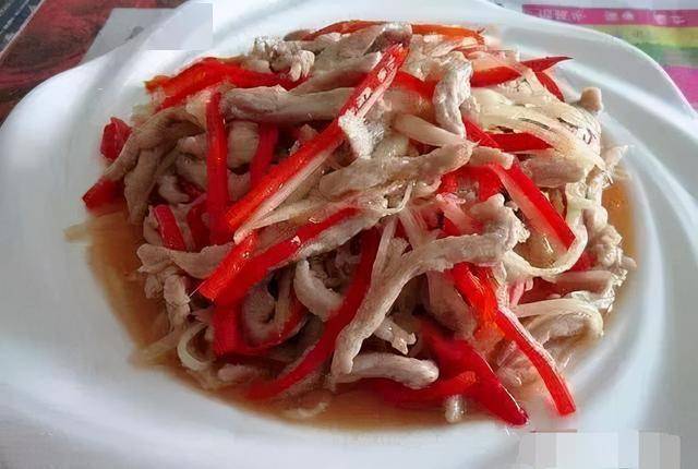 4。将肉丝、辣椒、葱拌匀,炒匀,加入少许黄酒和盐。