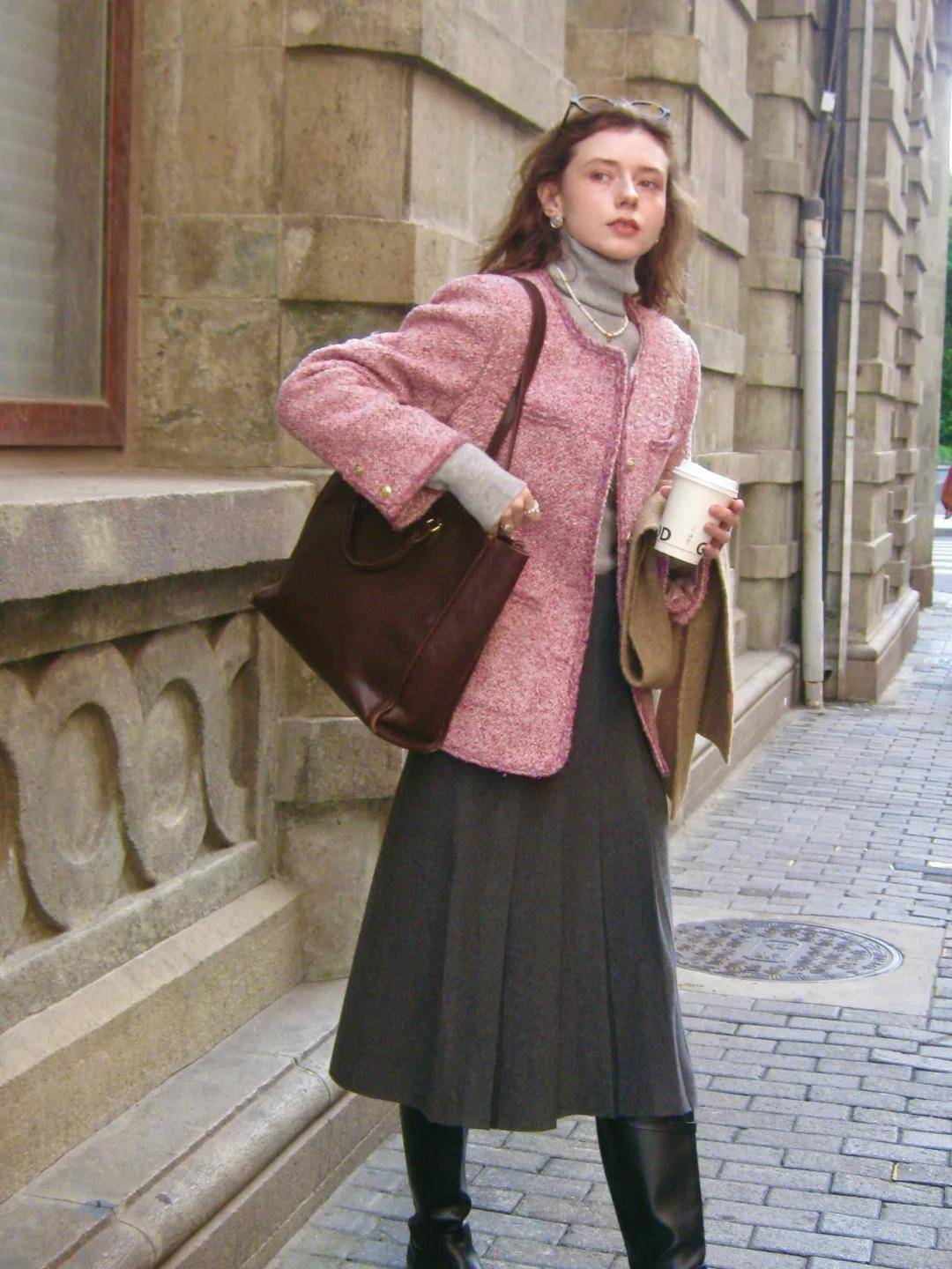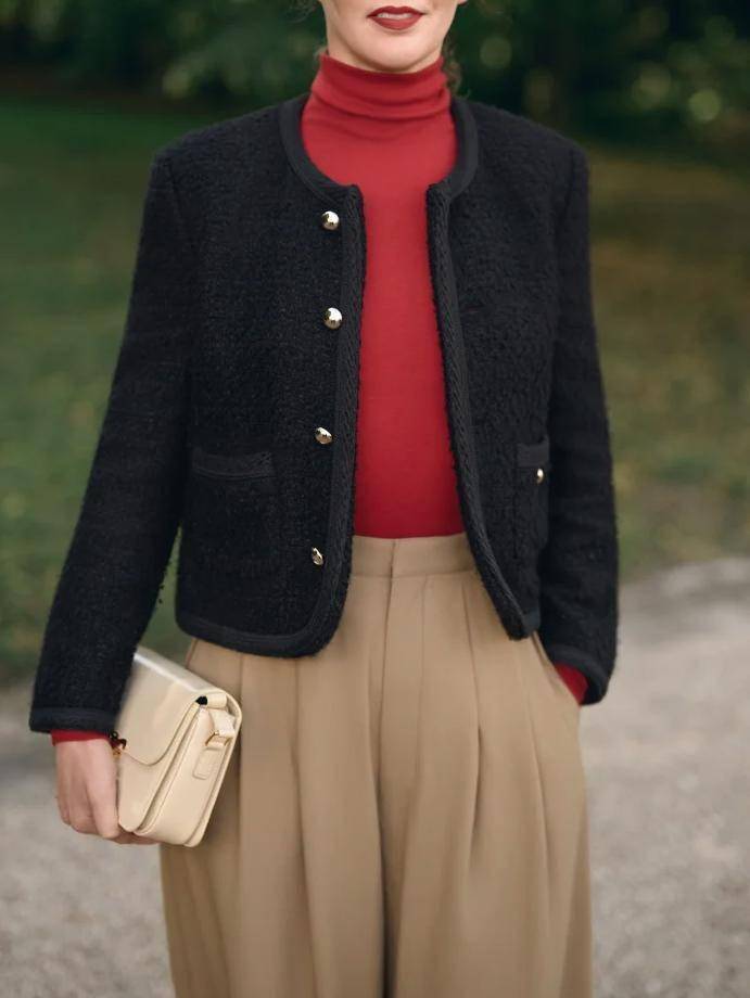 深色小香风外套,配一抹亮色高领衫(比如正红色),跨年、新年穿超合适,亮眼却不突兀,瞬间成为人群中的温柔焦点。