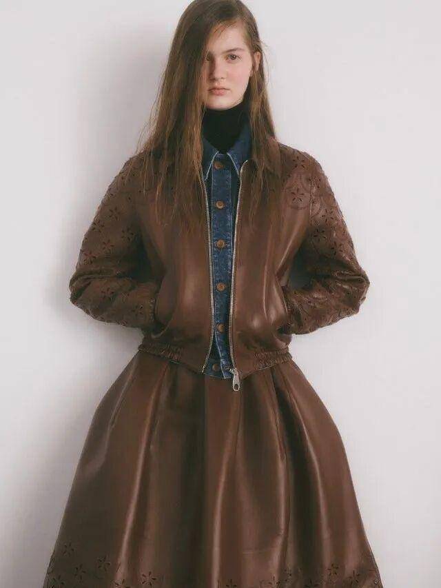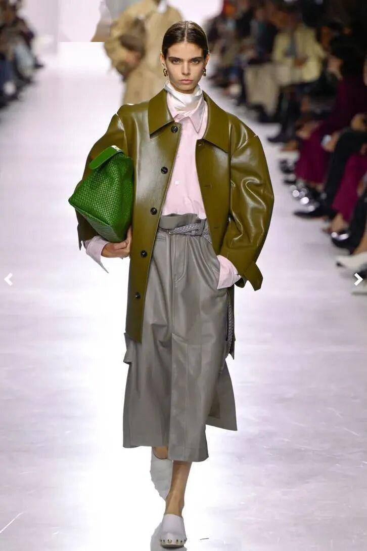 皮衣的硬朗质感,能完美包容各种细节层次。今年秀场超火的缎面高领衫,光泽感与皮质相互辉映,将女性的柔媚与英气平衡得恰到好处,一眼惊艳。