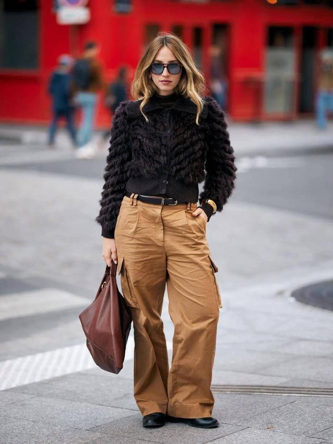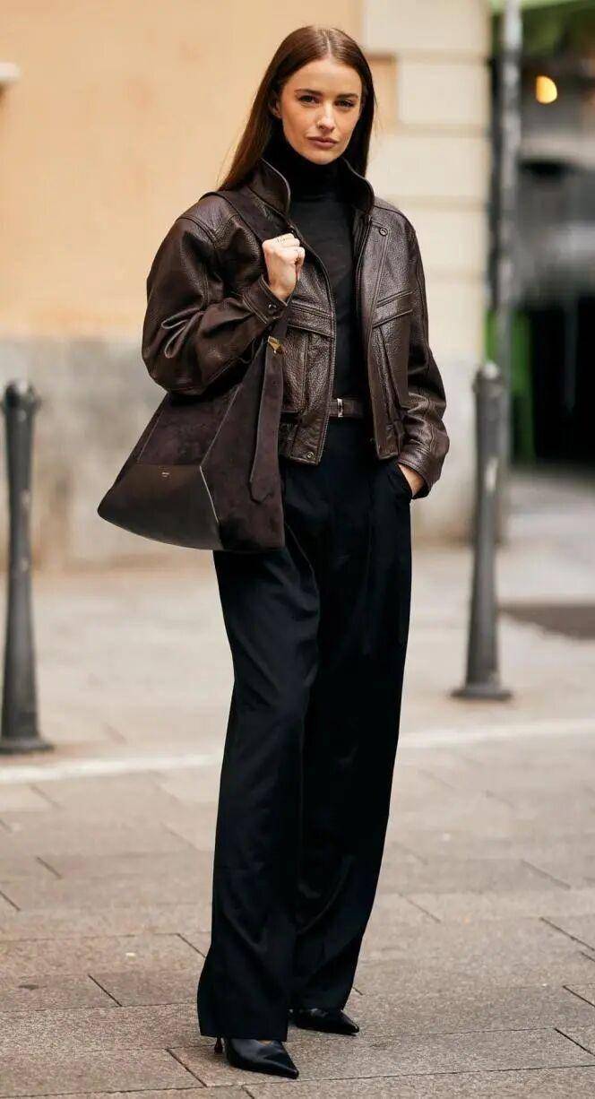 棕色、黑色、红色高领衫,都是经时髦精验证过的皮衣 “天选 CP”,轻松放大酷飒气质;
