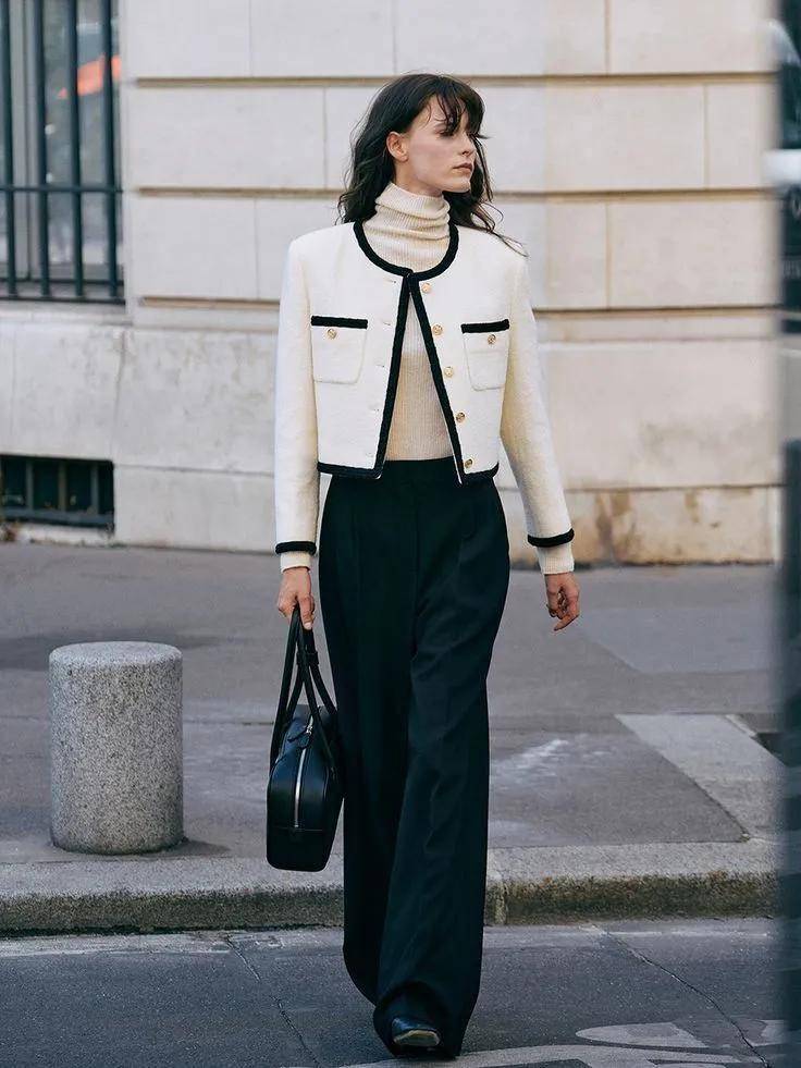 自带结构感的小香风外套,是冬日精致穿搭的代名词,而高领毛衣恰好能弥补它的小短板。
