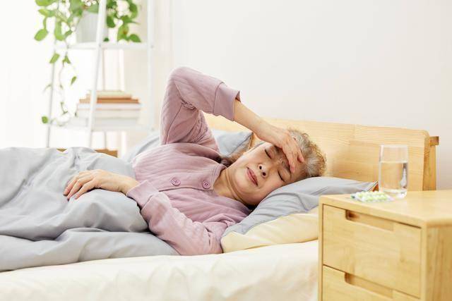 🖼️ 图片1 & 图片4 & 图片6 & 图片8:老年女性卧床,闭眼扶额、面露愁容