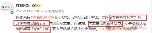 此次对于外界质疑“灵超机场打粉丝”,其经纪公司回应称灵超仅存在抢夺对方手机并摔坏屏幕的行为,且事情发生在高铁站不是机场,双方未发生肢体冲突。