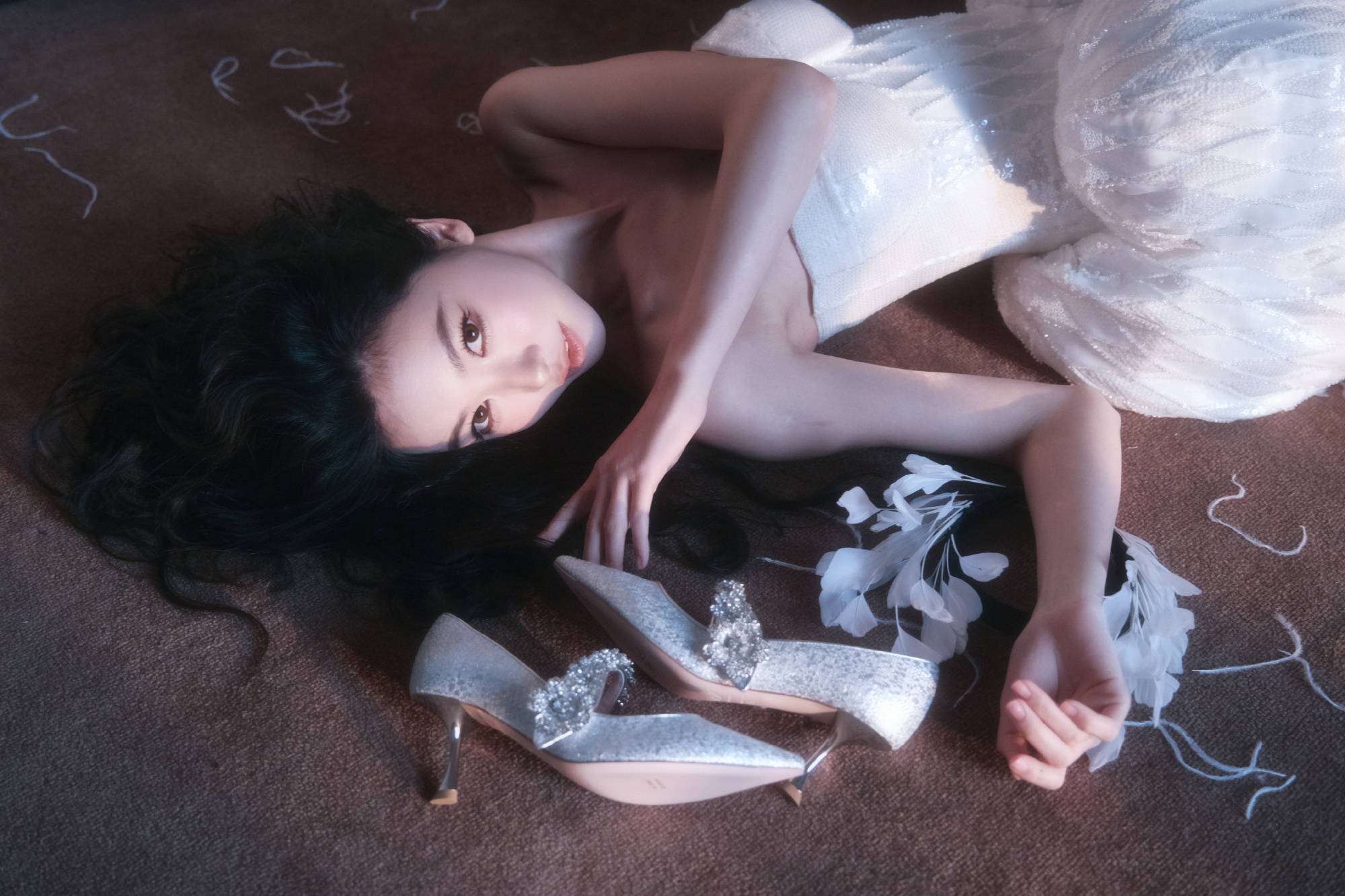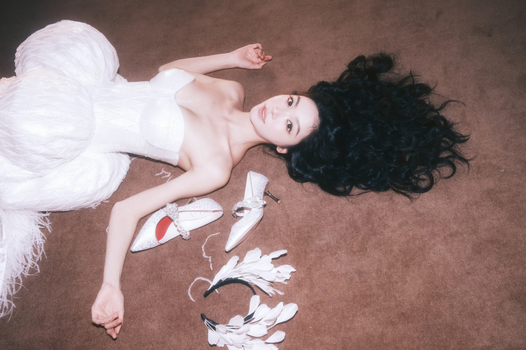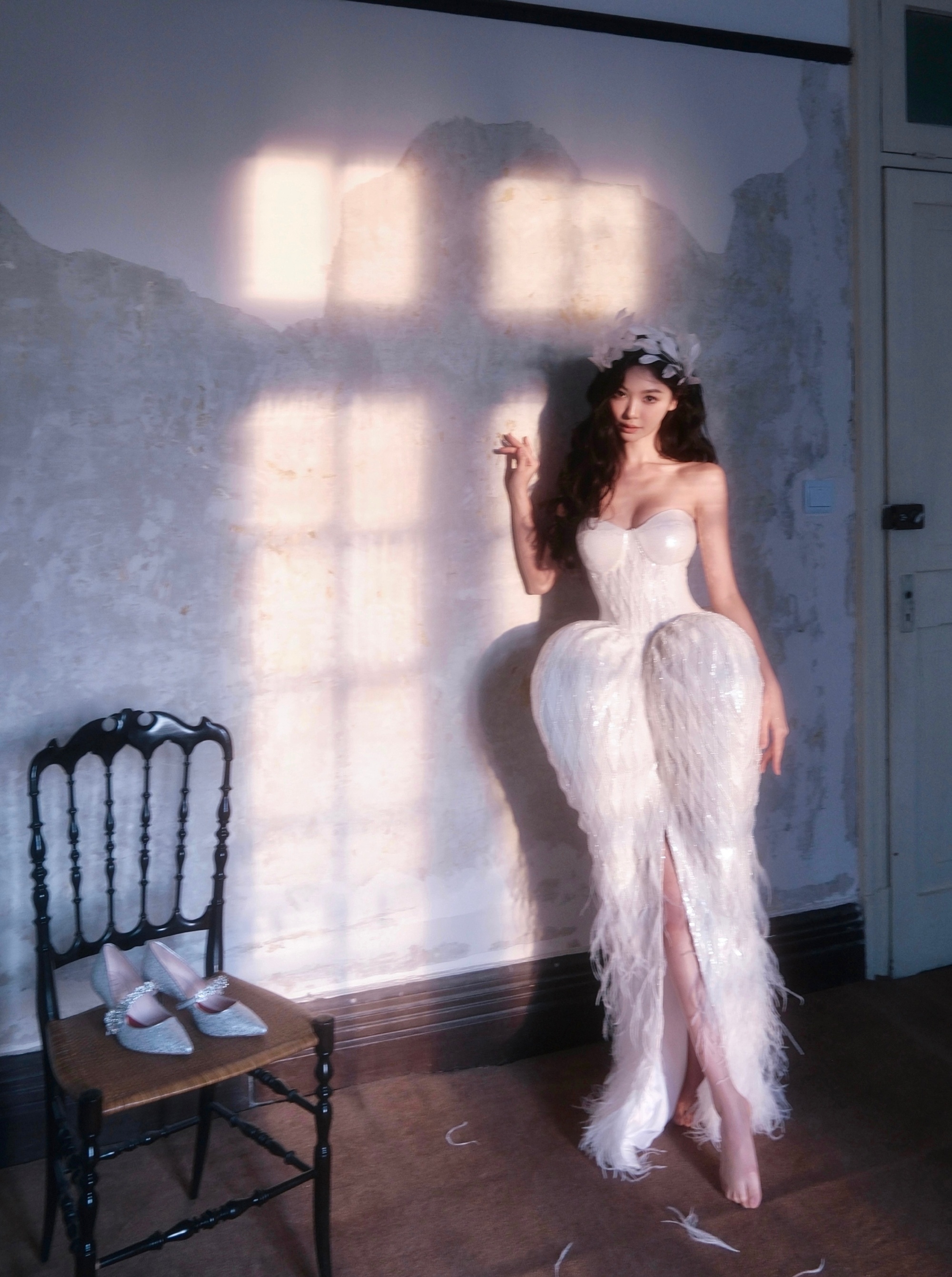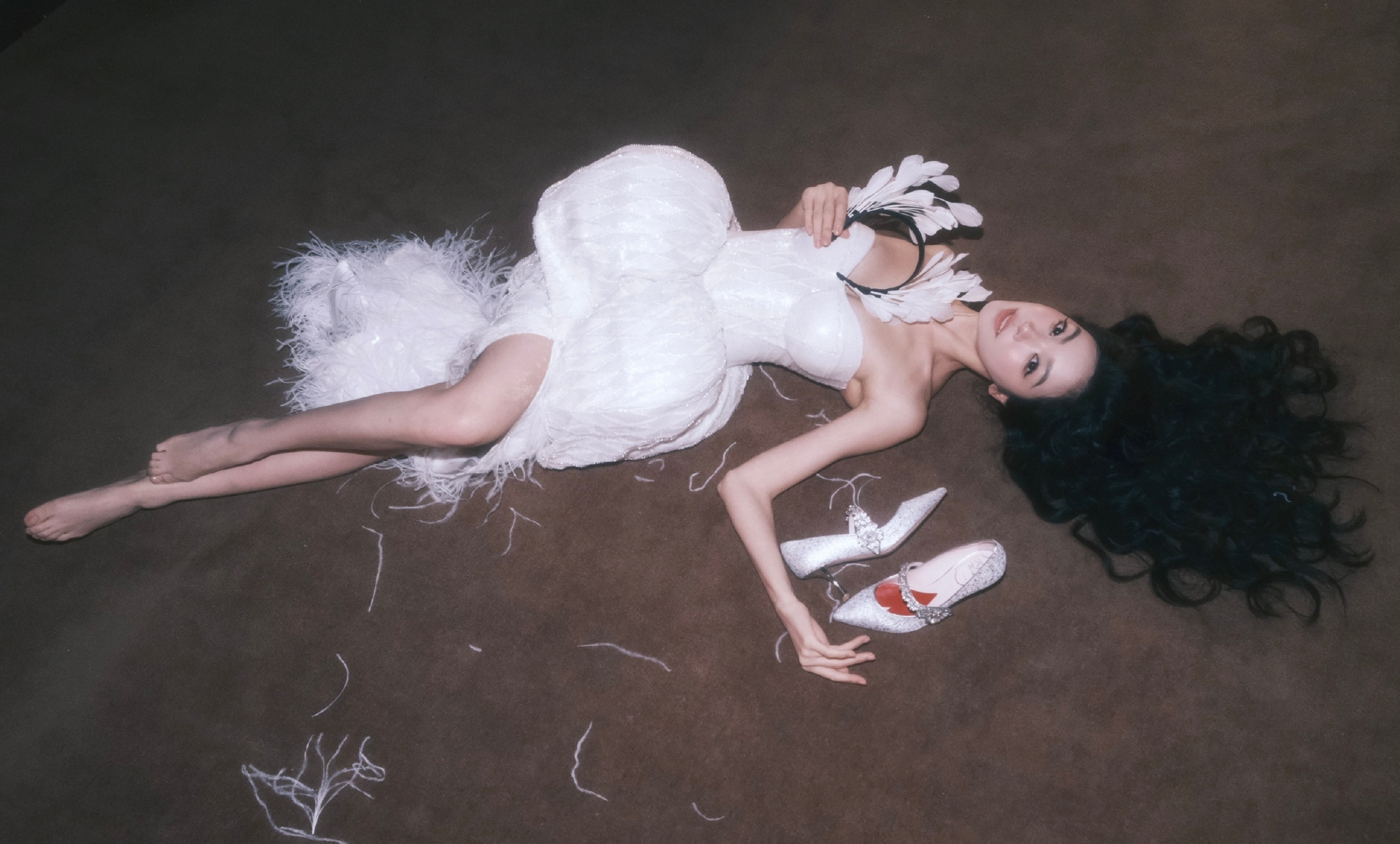 光脚大片的足尖美学:在黑色吊带裙的光脚大片中,她通过舒展的足弓、圆润的脚趾与绷直的脚背,将足部细节升华为艺术品。足尖轻点、交叠、一字马等摆姿,看似随性实则精心设计,用肢体语言传递慵懒张力,让腿部线条比高跟鞋更具致命吸引力。