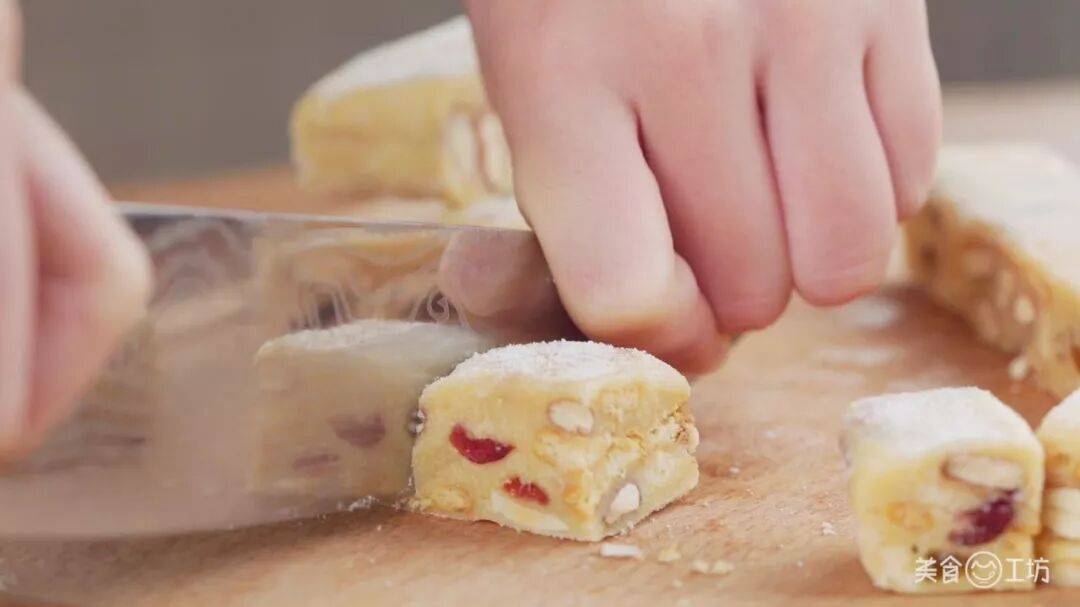 视觉之美:切面层次分明,奶白如雪,点缀着红润蔓越莓、金黄坚果,宛如一幅微型冬日拼贴画。