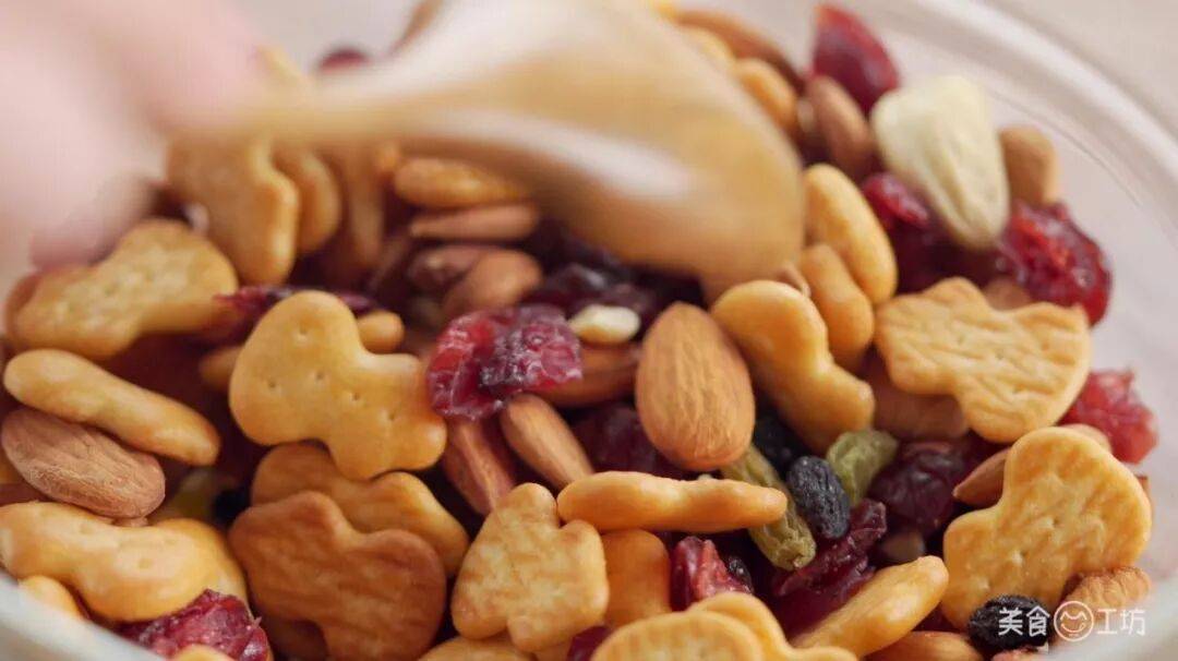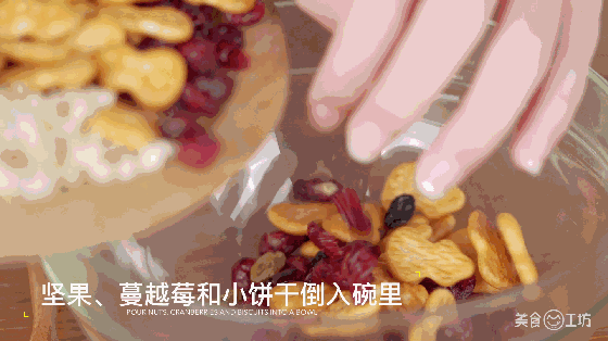 将蔓越莓、坚果、小饼干一同倒入大碗中轻轻拌匀,盖上保鲜膜备用。