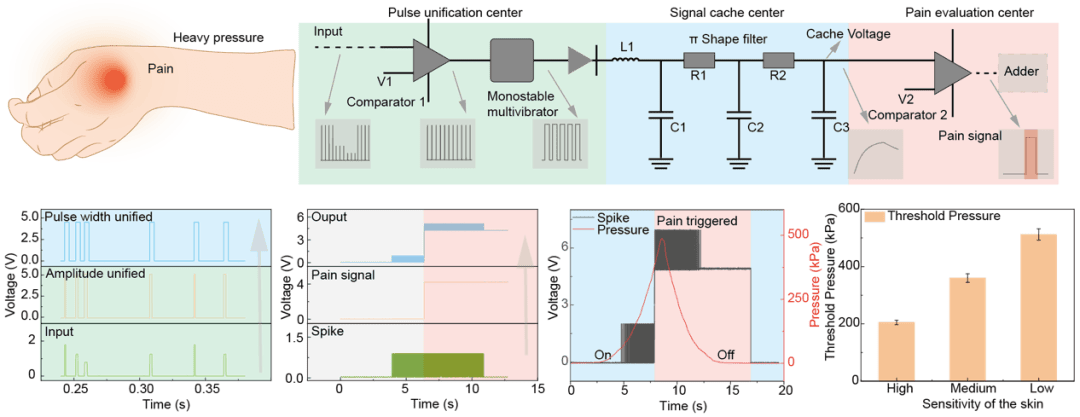 不同于传统电子皮肤被动输出模拟电压,NRE-skin采用主动脉冲编码机制,模拟生物神经的工作方式: