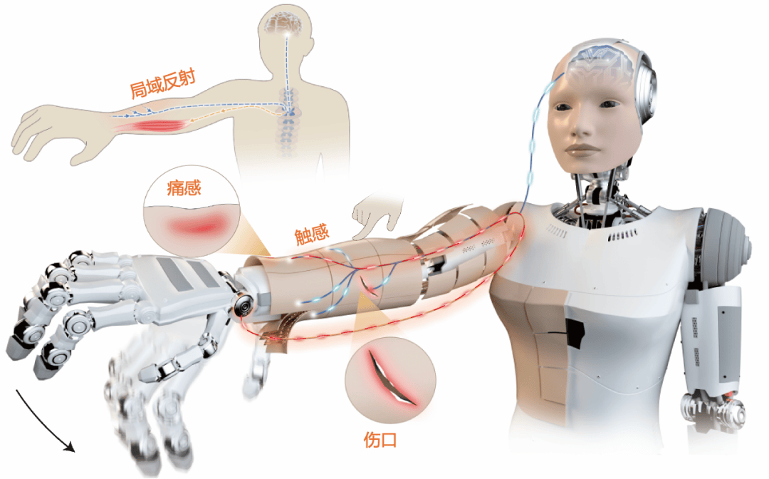 ✅ 图示支持:【图片1】中标注了“局域反射”“痛感”“触感”“伤口”等功能模块,并附有人体神经传导示意小图,体现仿生设计理念。