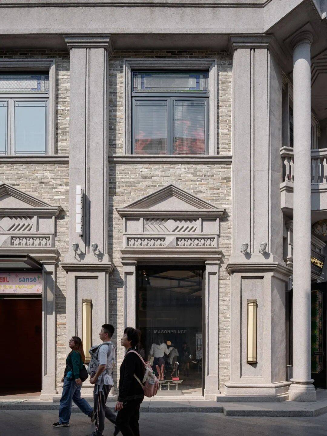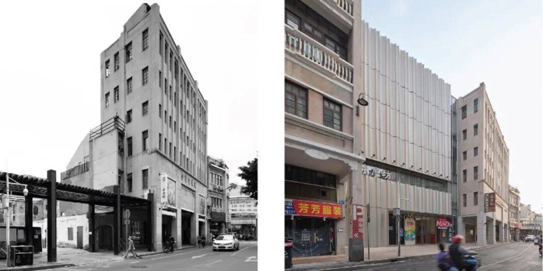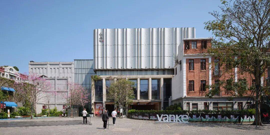 都设设计(上海都设营造建筑设计事务所有限公司)参与了永庆坊二期的核心项目——金声电影院改造。改造遵循“保留记忆、设计点彩、四两拨千斤”的理念:保留金声电影院原有沿街骑楼与危墙等历史片段,新建部分采用“上新下古”的立面设计(上半部分承载文化演绎功能,下半部分延续传统商业骑楼界面);引入现代livehouse功能,将旧影院空间赋予新活力;