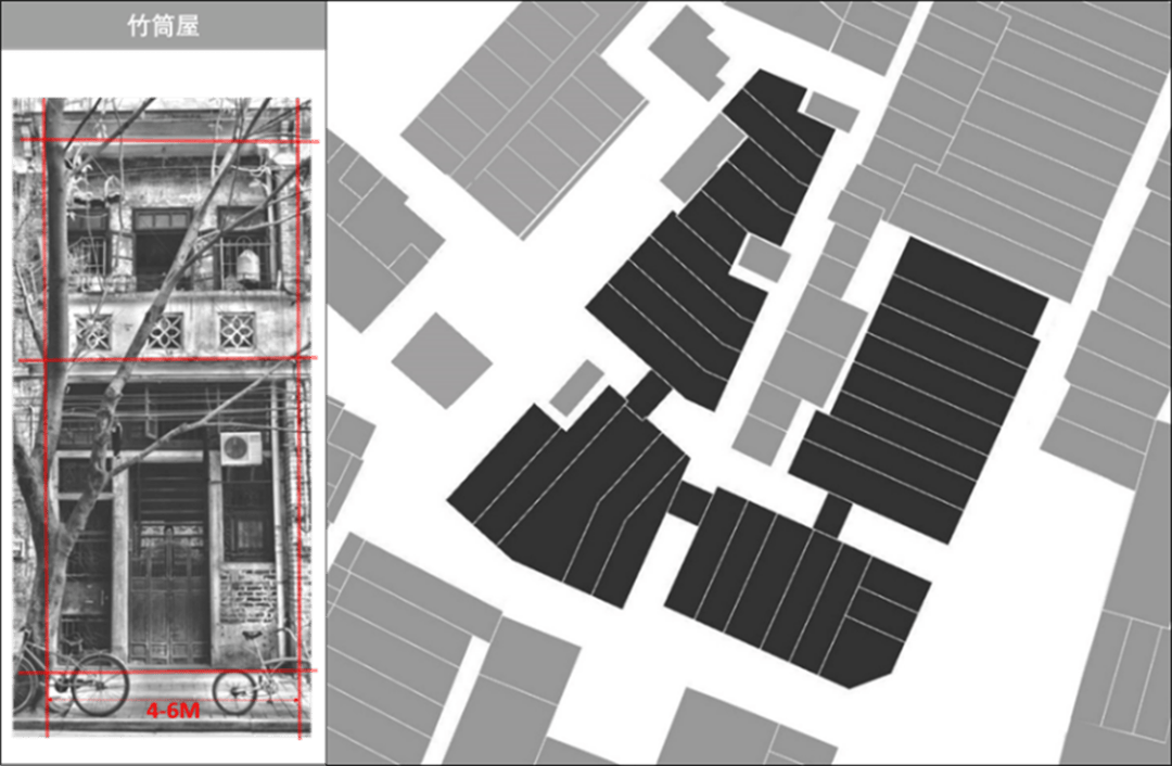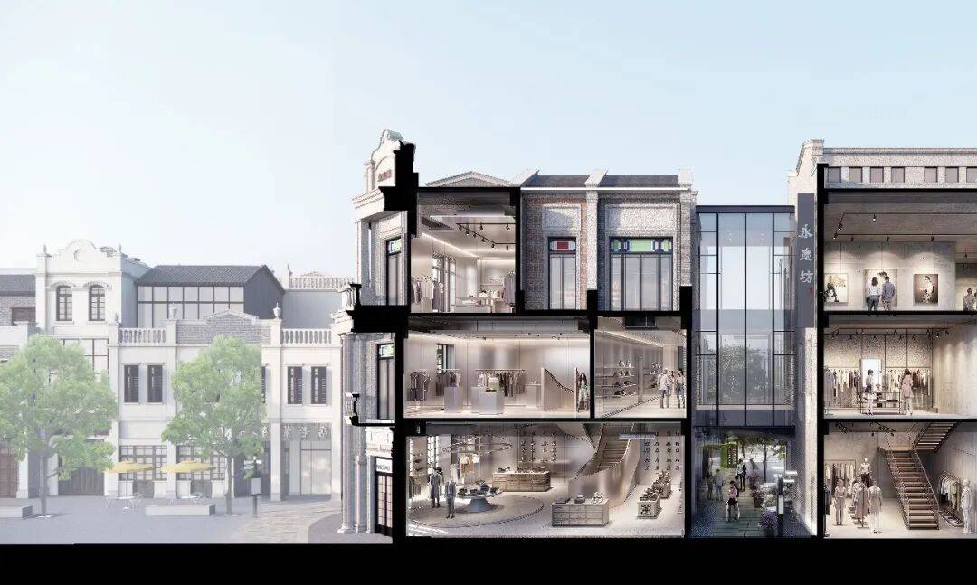 建筑是凝固的音乐,永庆坊的建筑更新是对岭南建筑美学的一次深度致敬与现代转译。在永庆坊片区,具有窄面宽、大进深的特征的竹筒屋是上百年来的特色。竹筒屋建筑沿着街道紧密排布,门面窄小、纵深狭长,开间宽约4-6米,进深约7-12米。都设深入研究传统竹筒屋的空间模式,提取其本质特征,适当的微调以满足现代商业的需求并通过现代手法进行重新诠释。