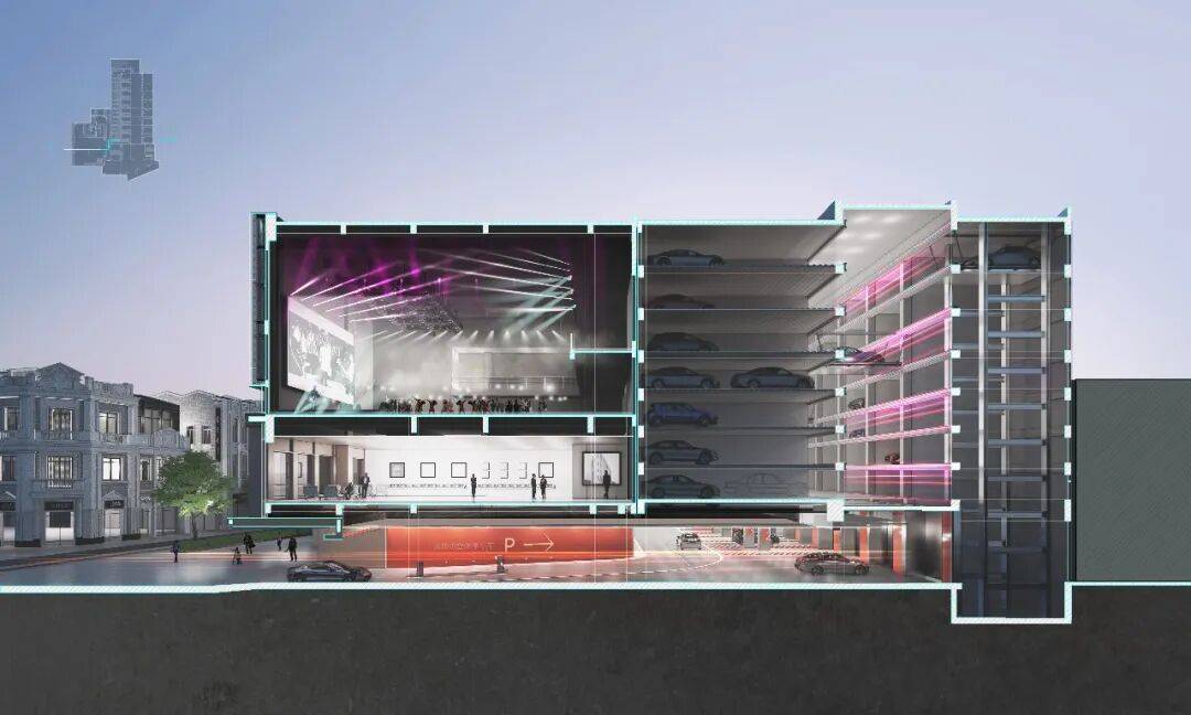 - 以仅剩残墙的金声电影院为核心,打造立体机械式无人车库,在几千平米内实现300-400个车位,破解百万客流的停车难题。