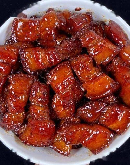 画面描述:一碗红棕色红烧肉,油亮诱人,肉质饱满,汤汁浓郁。