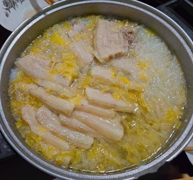 6. 把切好的白肉片重新放入锅中,加入泡软的粉条,继续炖煮10分钟至粉条透明。