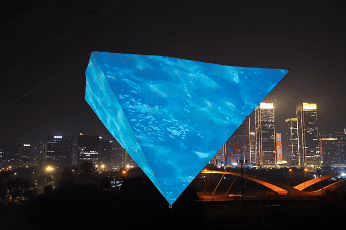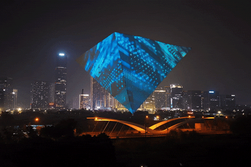 夜晚:灯光与投影交织,表面成为流动的信息画布;