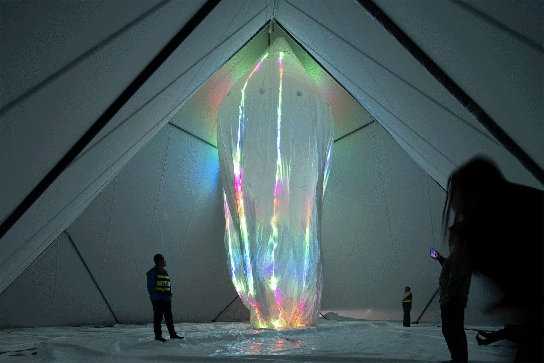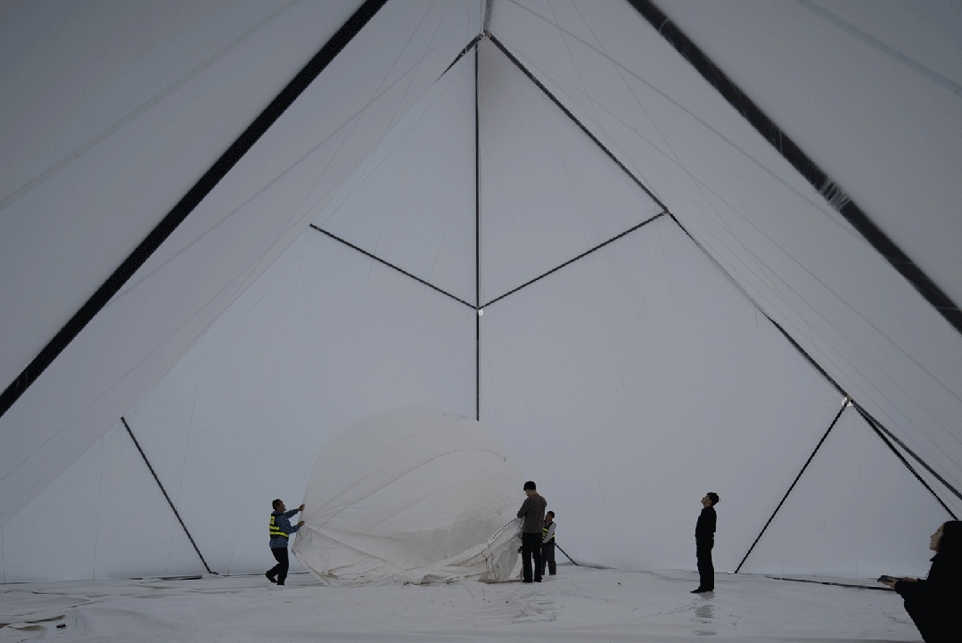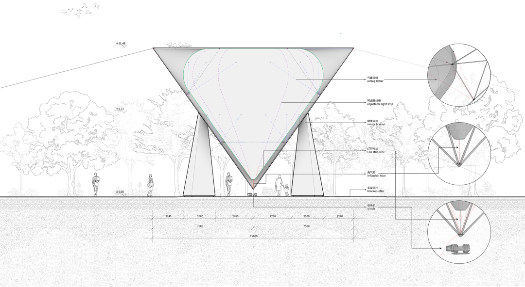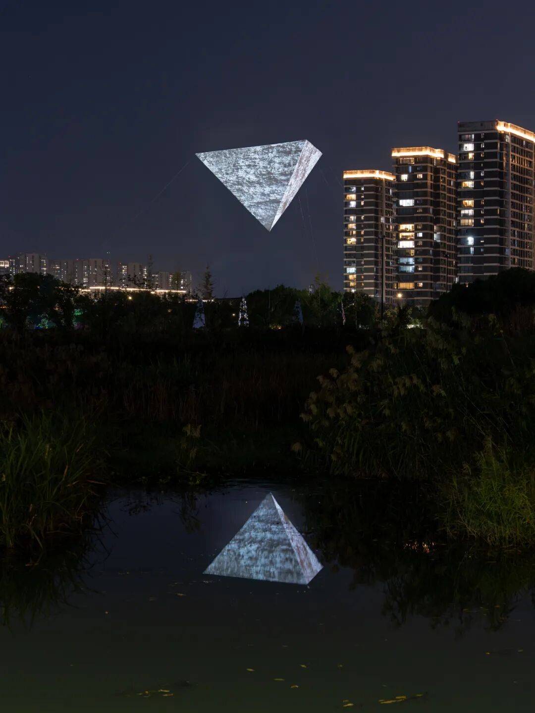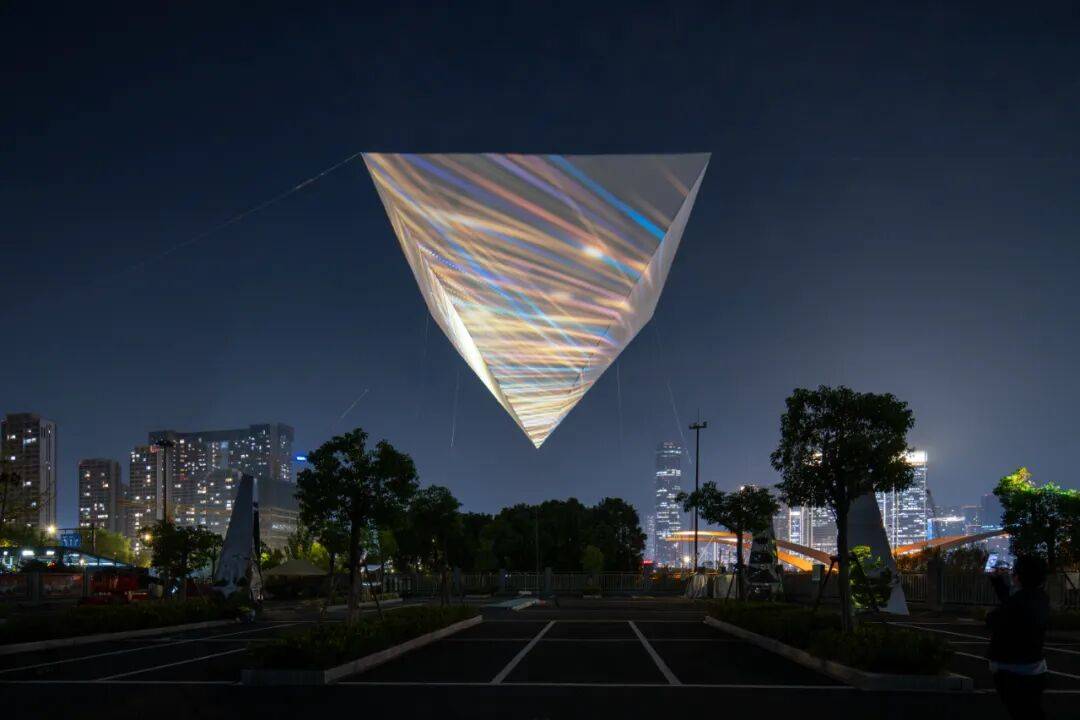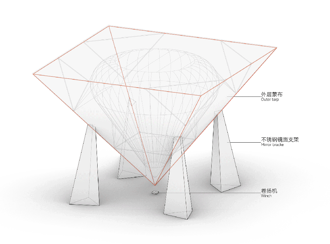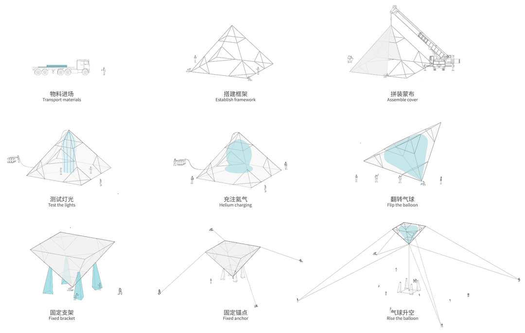在保证大 尺度视觉冲击的同时,将整体重量控制在可升空阈值内,并维持建筑级形态完整性。