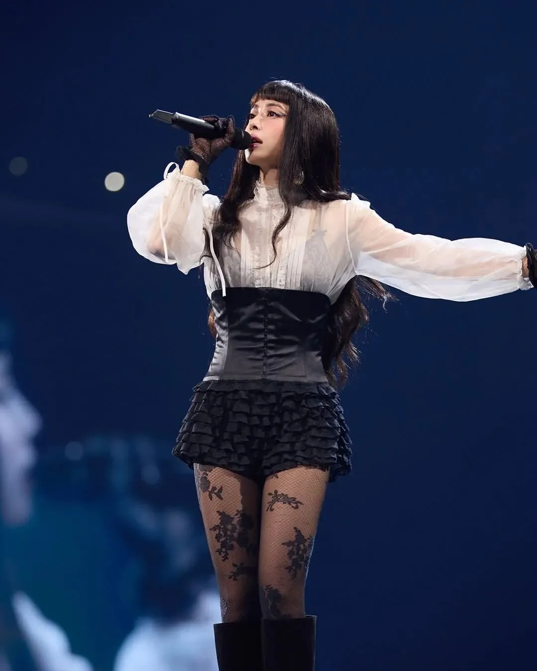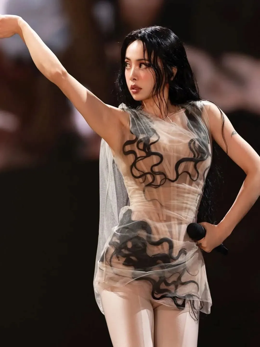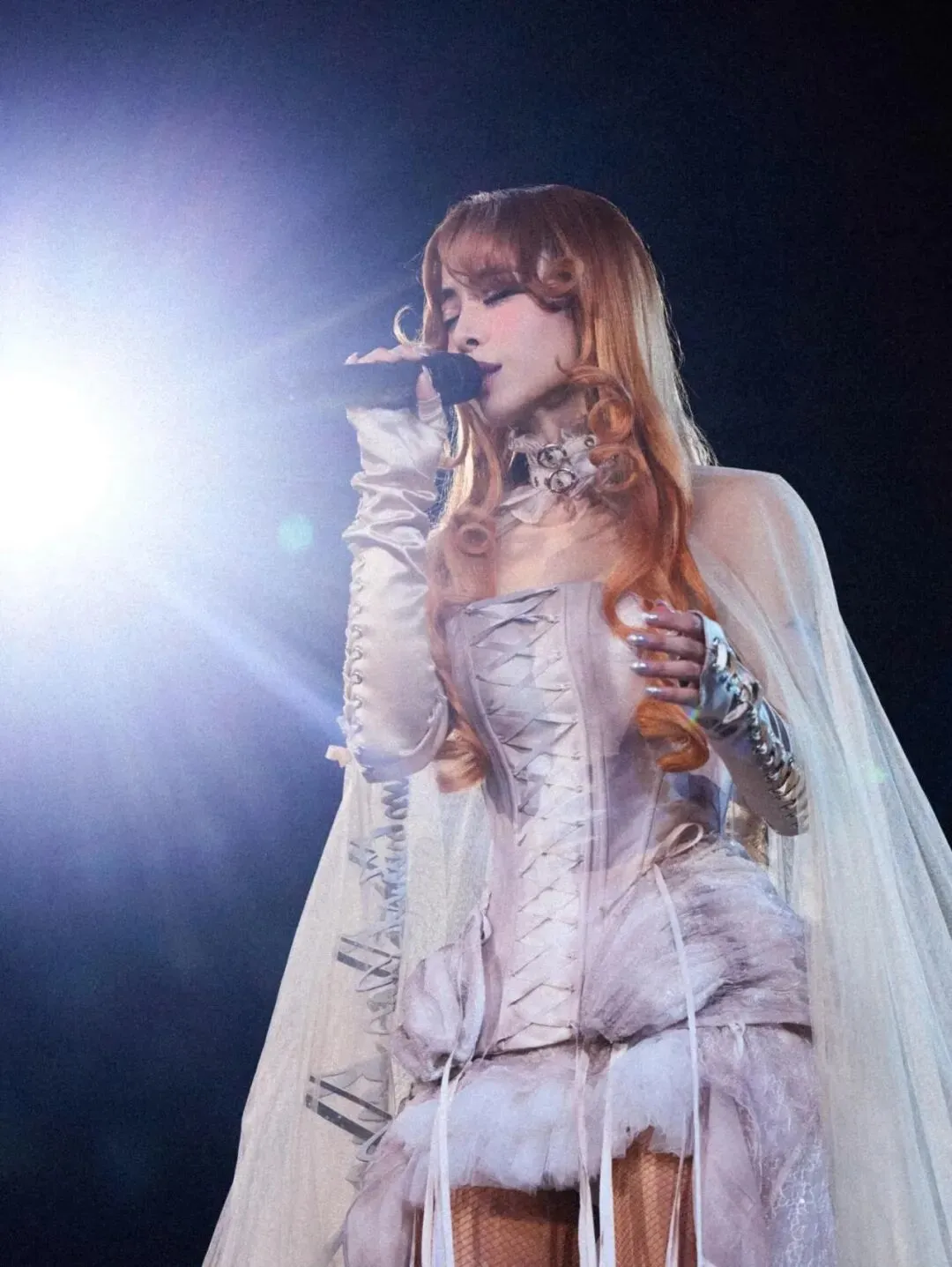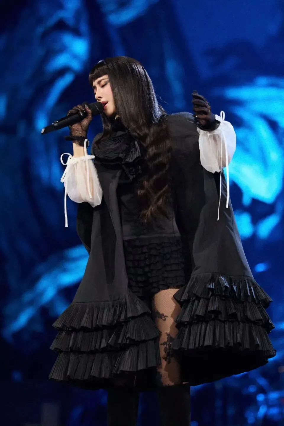 设计:外层透肤网纱,里层鱼骨胸衣,中间层缠绕发丝,与湿发映衬,展现暗黑浪漫气息。首次登台运动鞋搭配此造型,轻盈灵动。