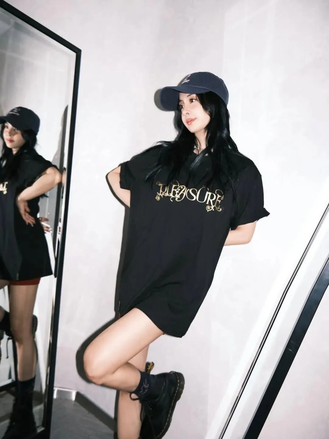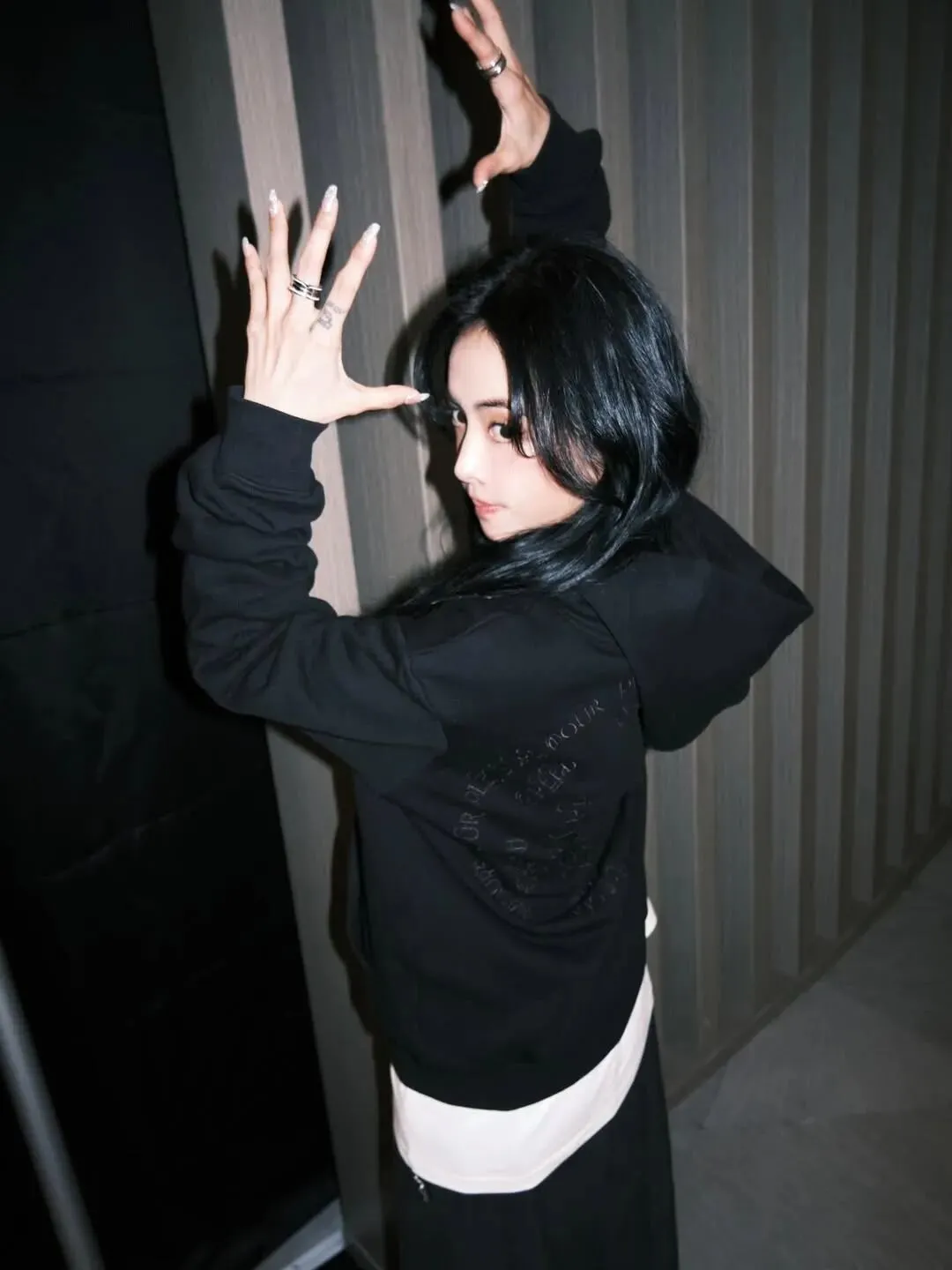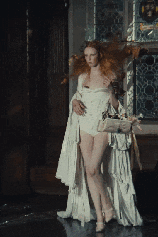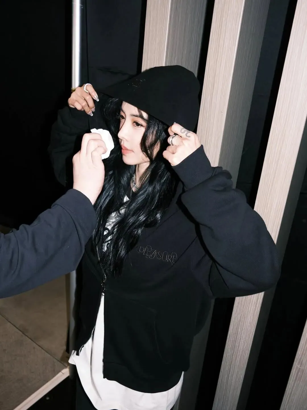 设计:外层透肤网纱,里层鱼骨胸衣,中间层缠绕发丝,与湿发映衬,展现暗黑浪漫气息。首次登台运动鞋搭配此造型,轻盈灵动。
