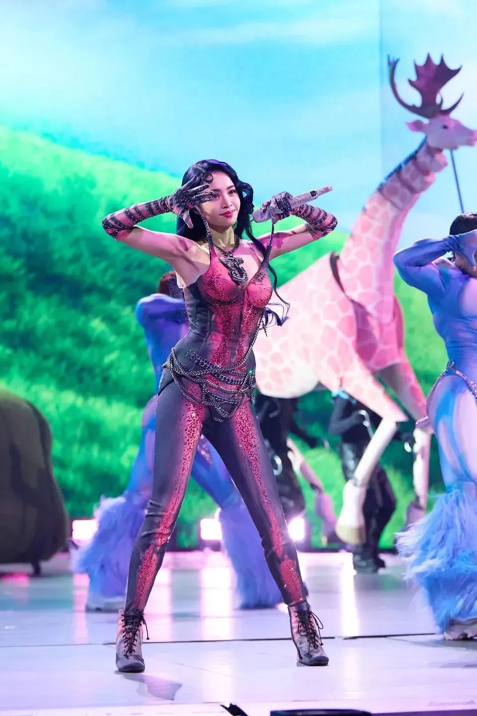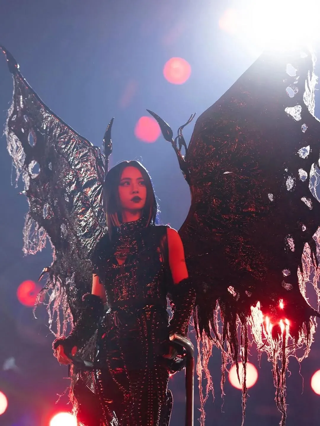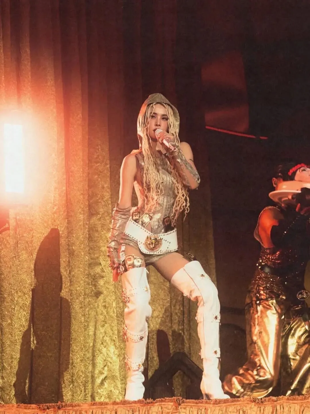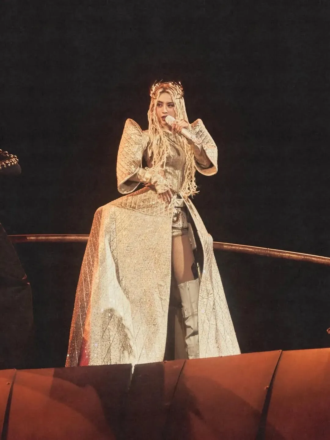设计:大量皮革与铆钉装饰的紧身裤装,镂空设计勾勒身材曲线,搭配Nihai高跟鞋。演唱《Bloody Mary》时,配合“贪婪金猪”撒钞机装置,将原欲主题推向极致。