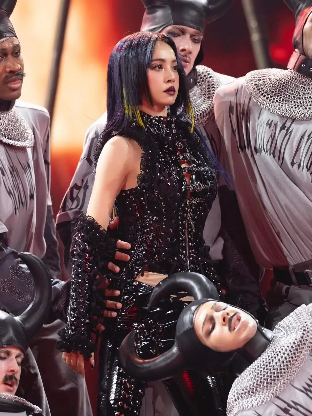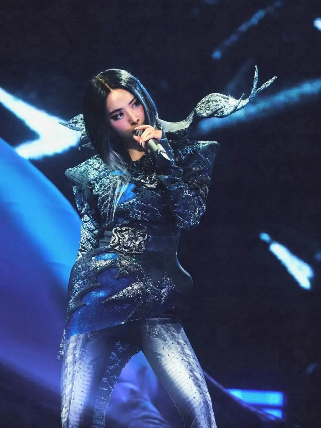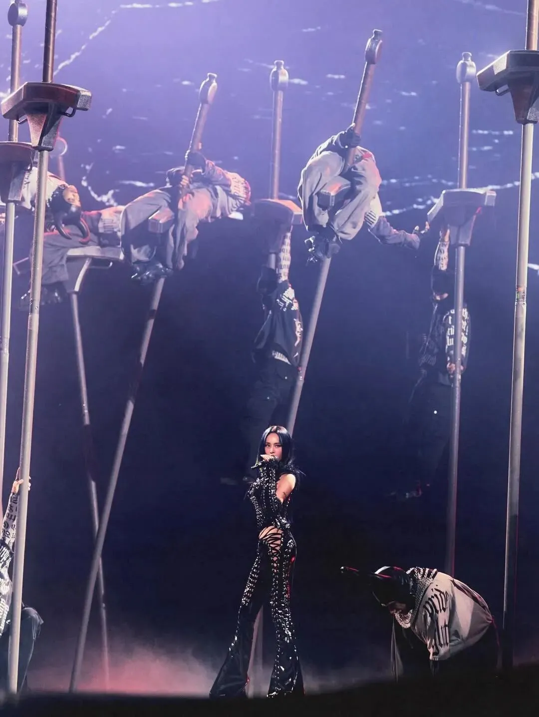设计:大量皮革与铆钉装饰的紧身裤装,镂空设计勾勒身材曲线,搭配Nihai高跟鞋。演唱《Bloody Mary》时,配合“贪婪金猪”撒钞机装置,将原欲主题推向极致。
