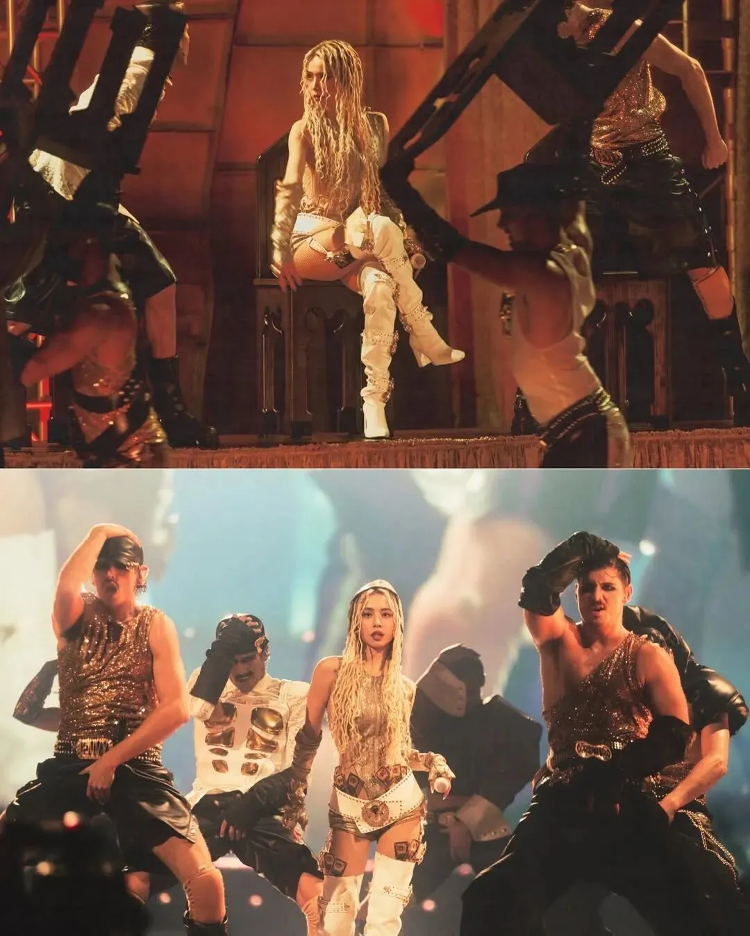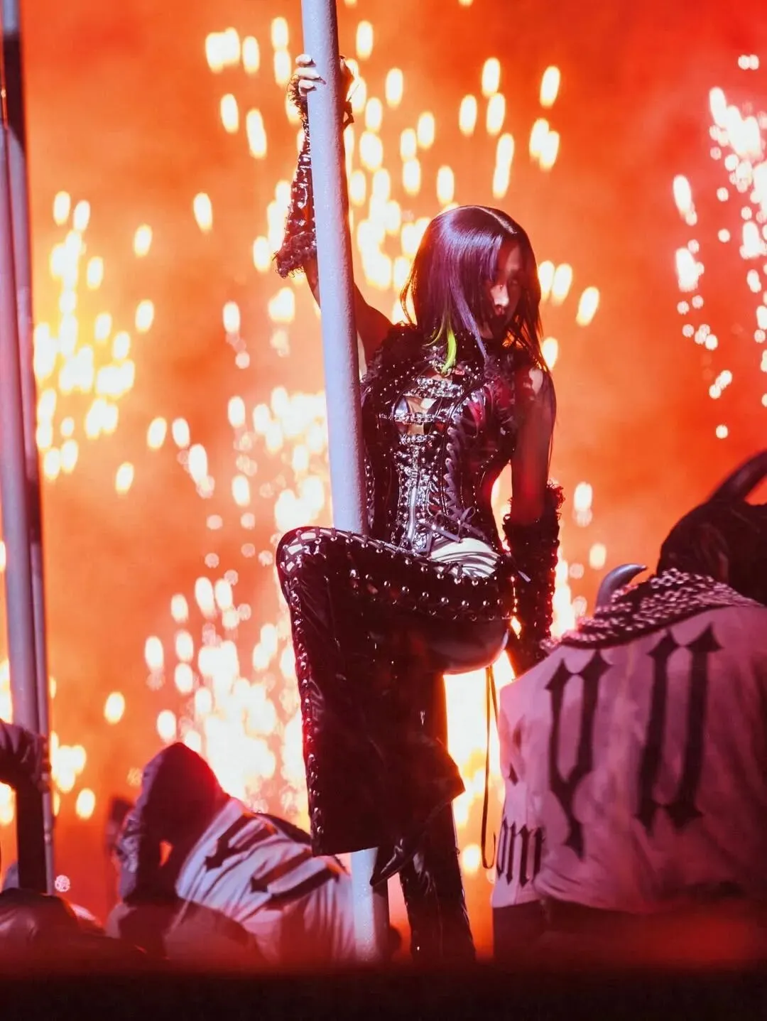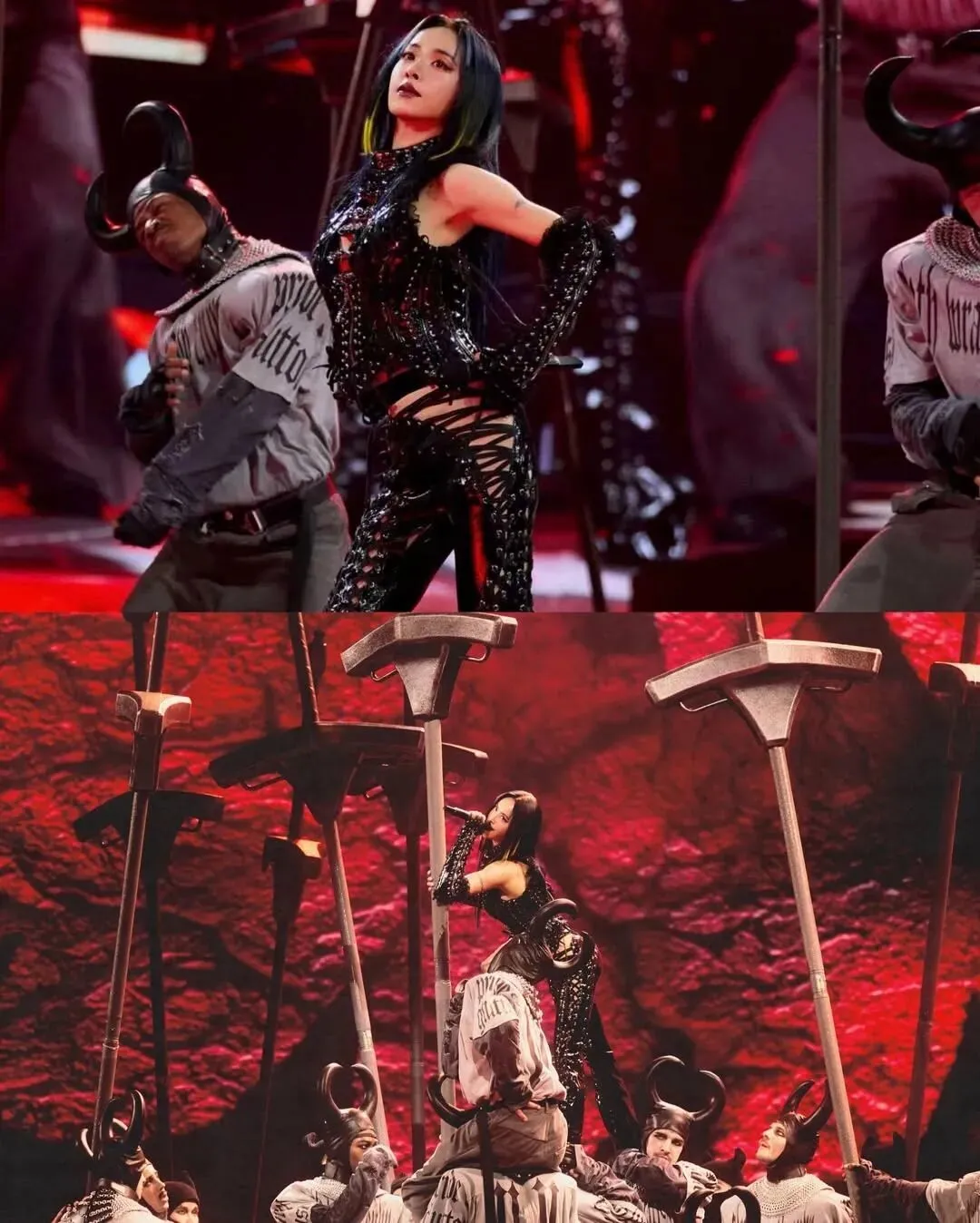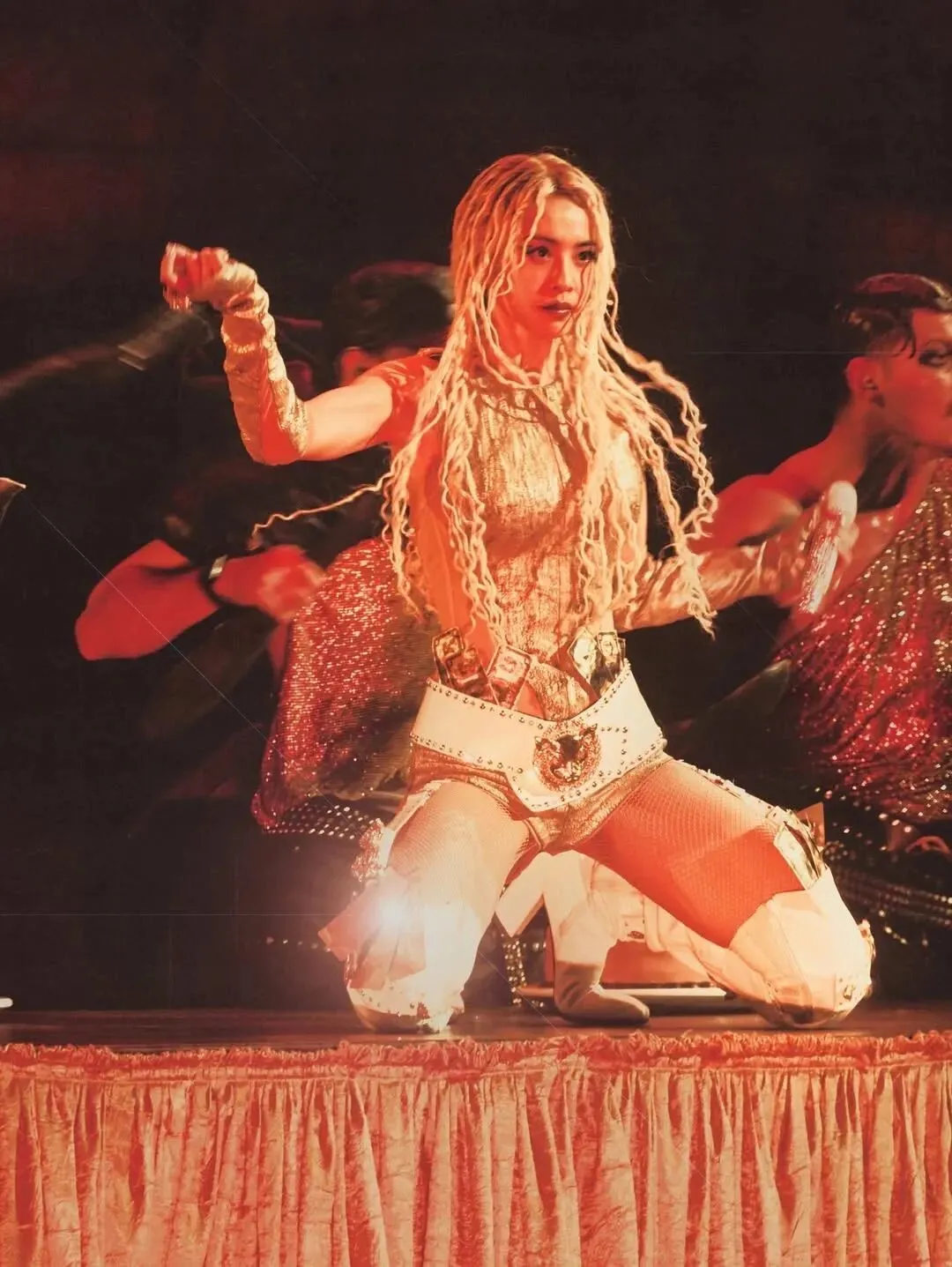 设计:大量皮革与铆钉装饰的紧身裤装,镂空设计勾勒身材曲线,搭配Nihai高跟鞋。演唱《Bloody Mary》时,配合“贪婪金猪”撒钞机装置,将原欲主题推向极致。