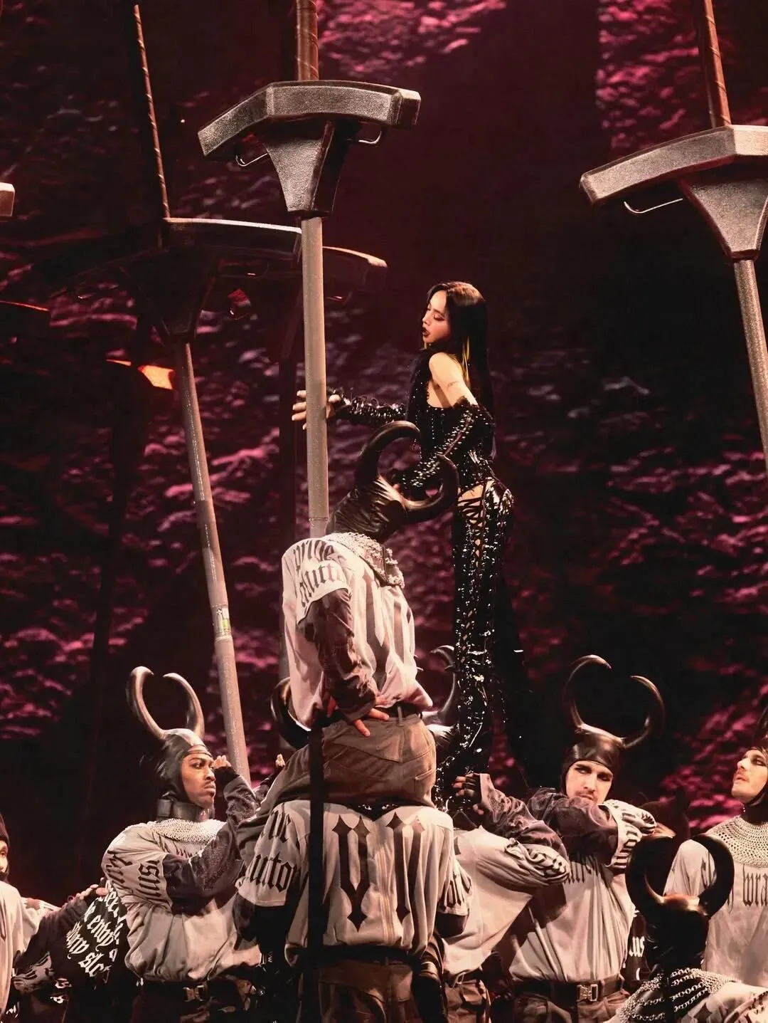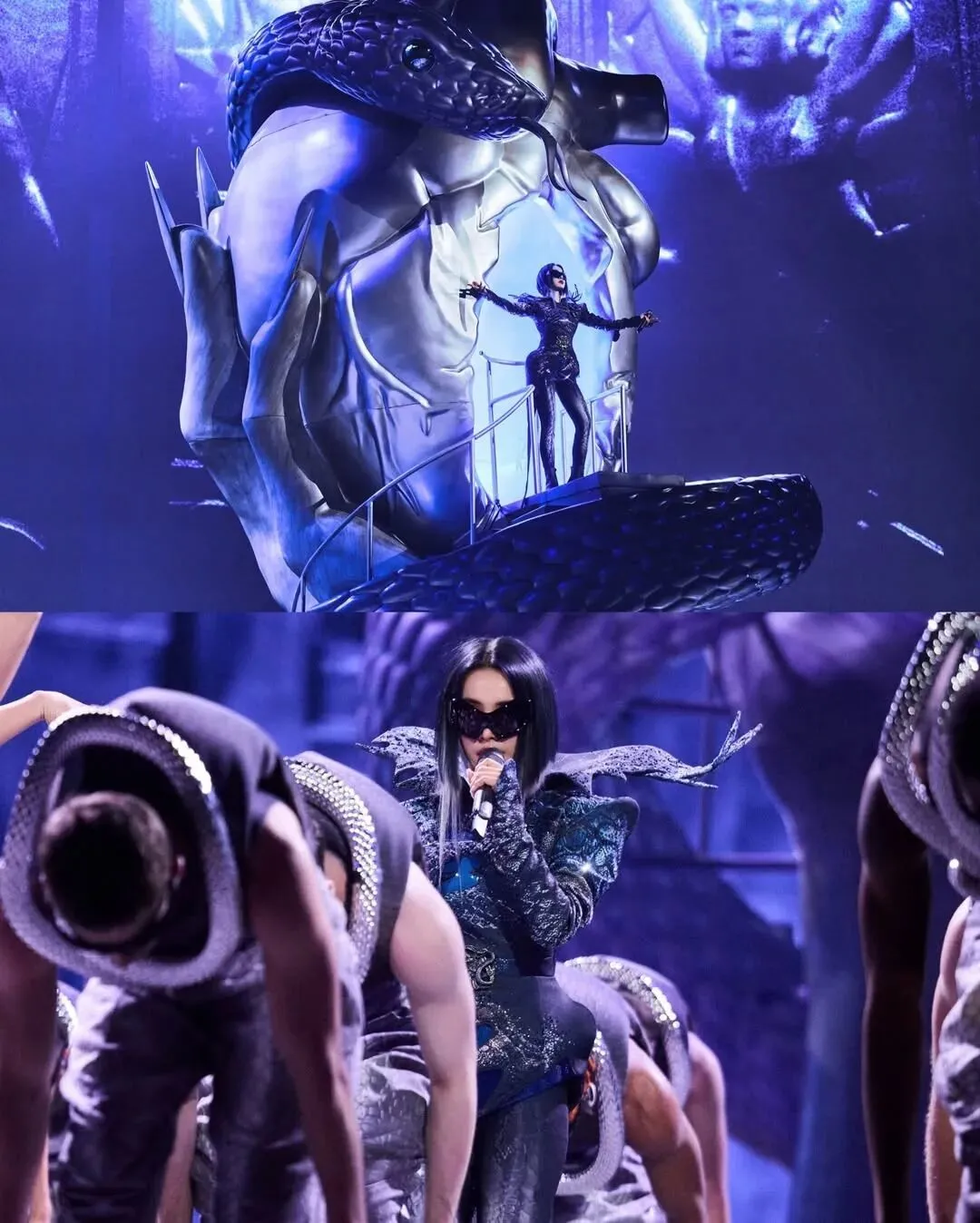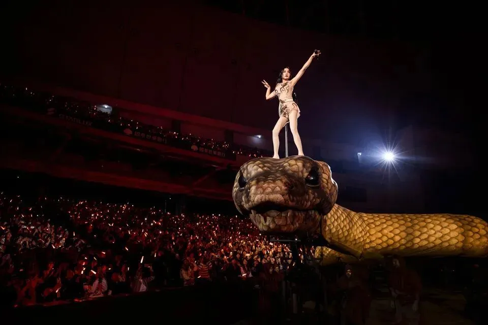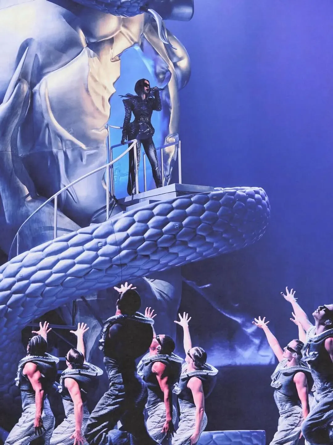 最令人震撼的是开场后的“美杜莎女王”桥段——蔡依林站在一条30米长、可360度旋转的机械巨蛇上,无防护绕场演唱《美杜莎》。这条内置液压系统的“赛博巨蟒”鳞片反光、蛇信随节奏微动,配合猩红灯光与烟雾特效,营造出神祇降临般的压迫感。据披露,单这一道具造价就达3700万人民币,而整场舞美成本超过1.7亿人民币。