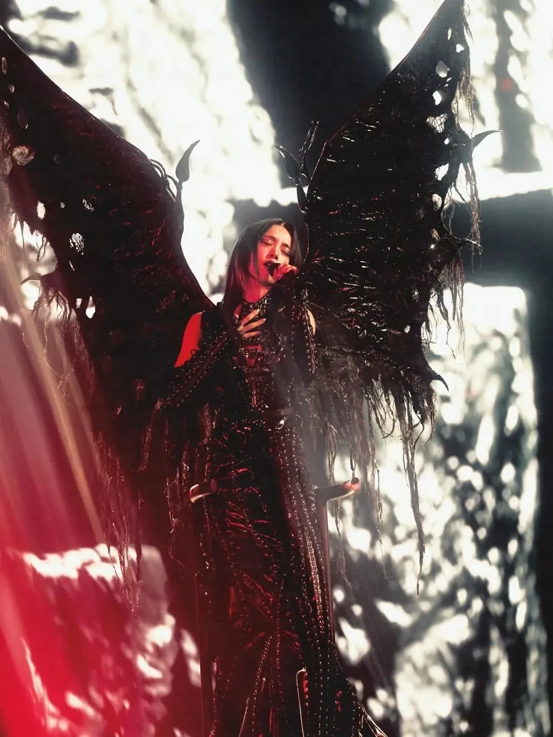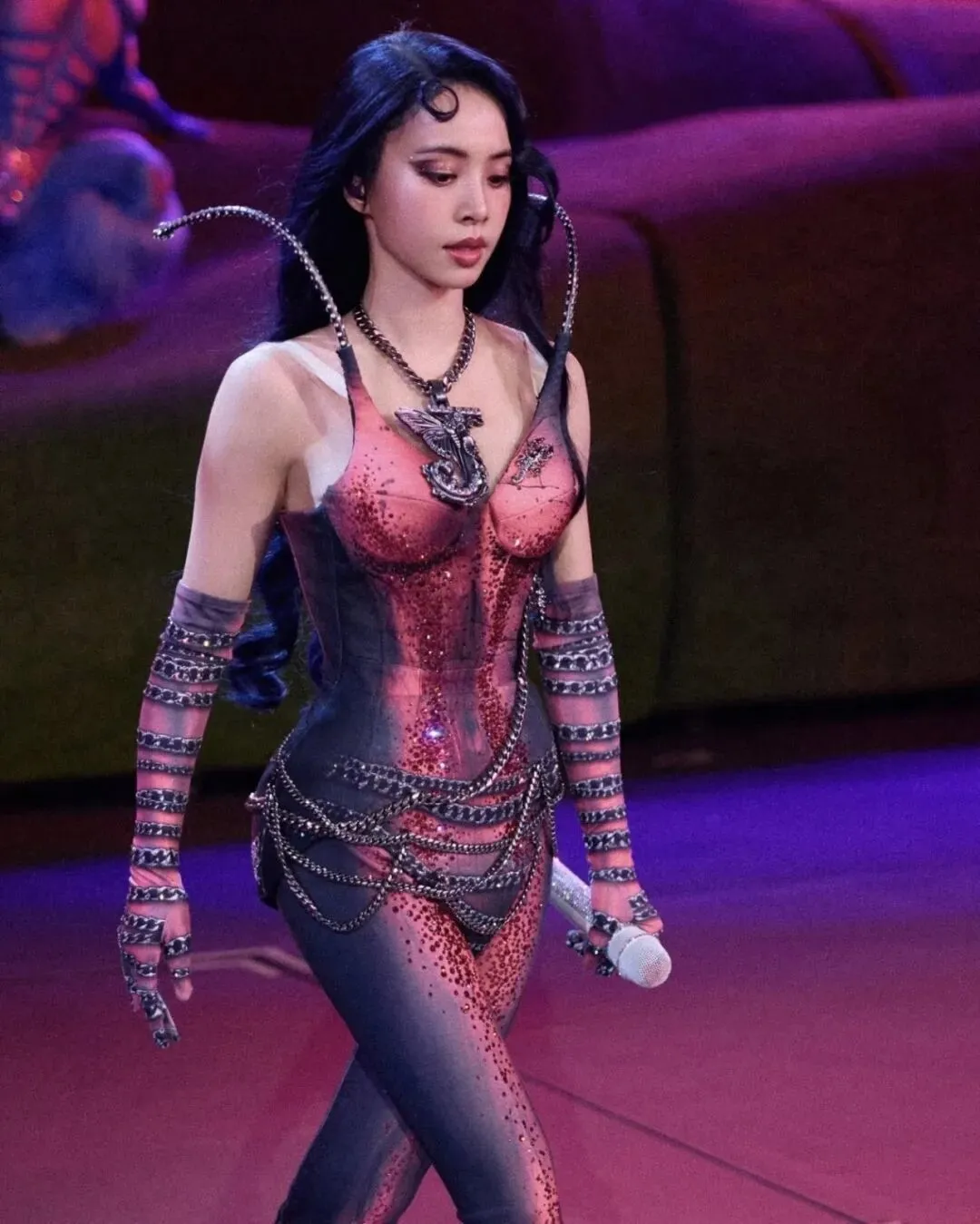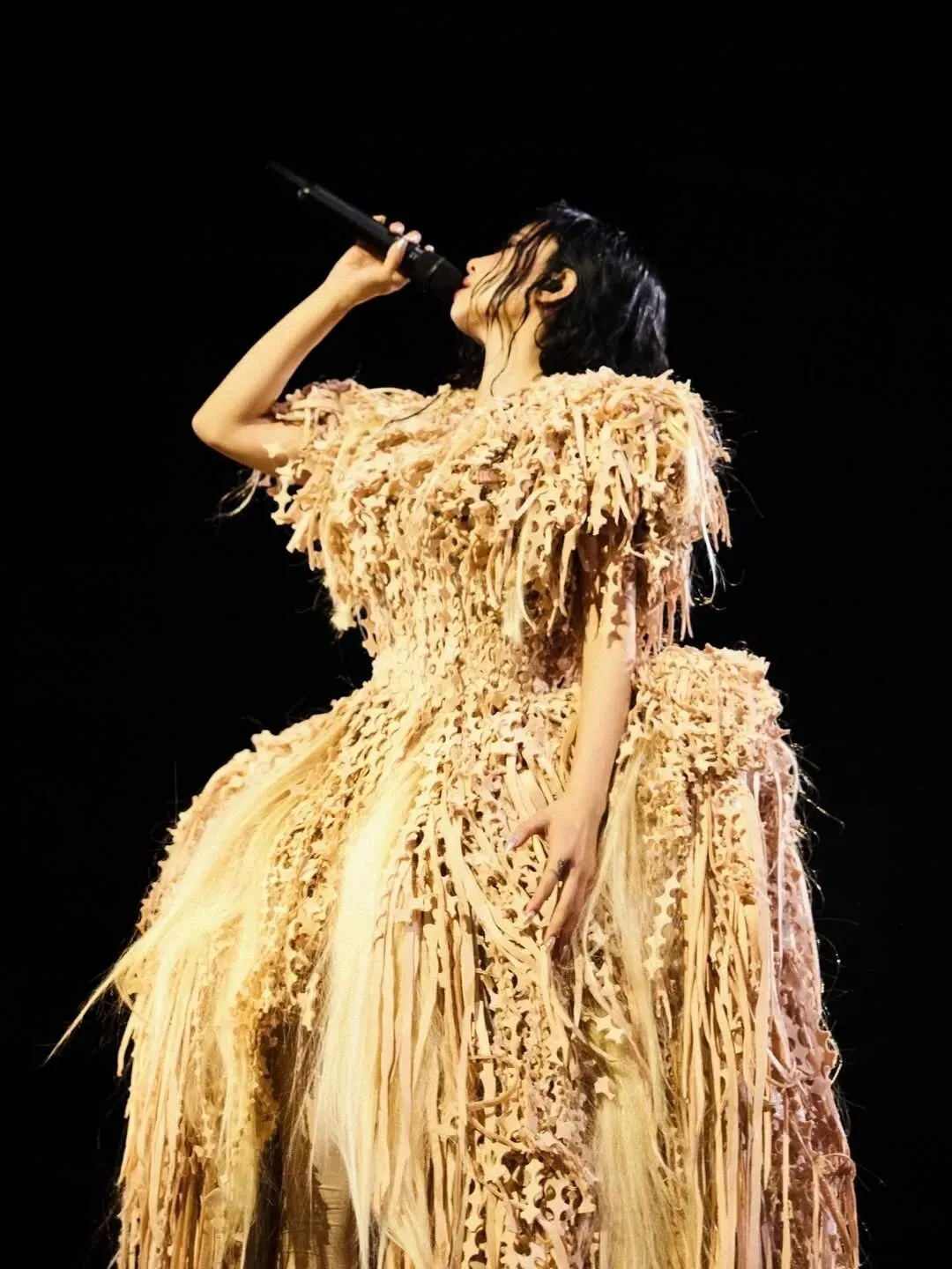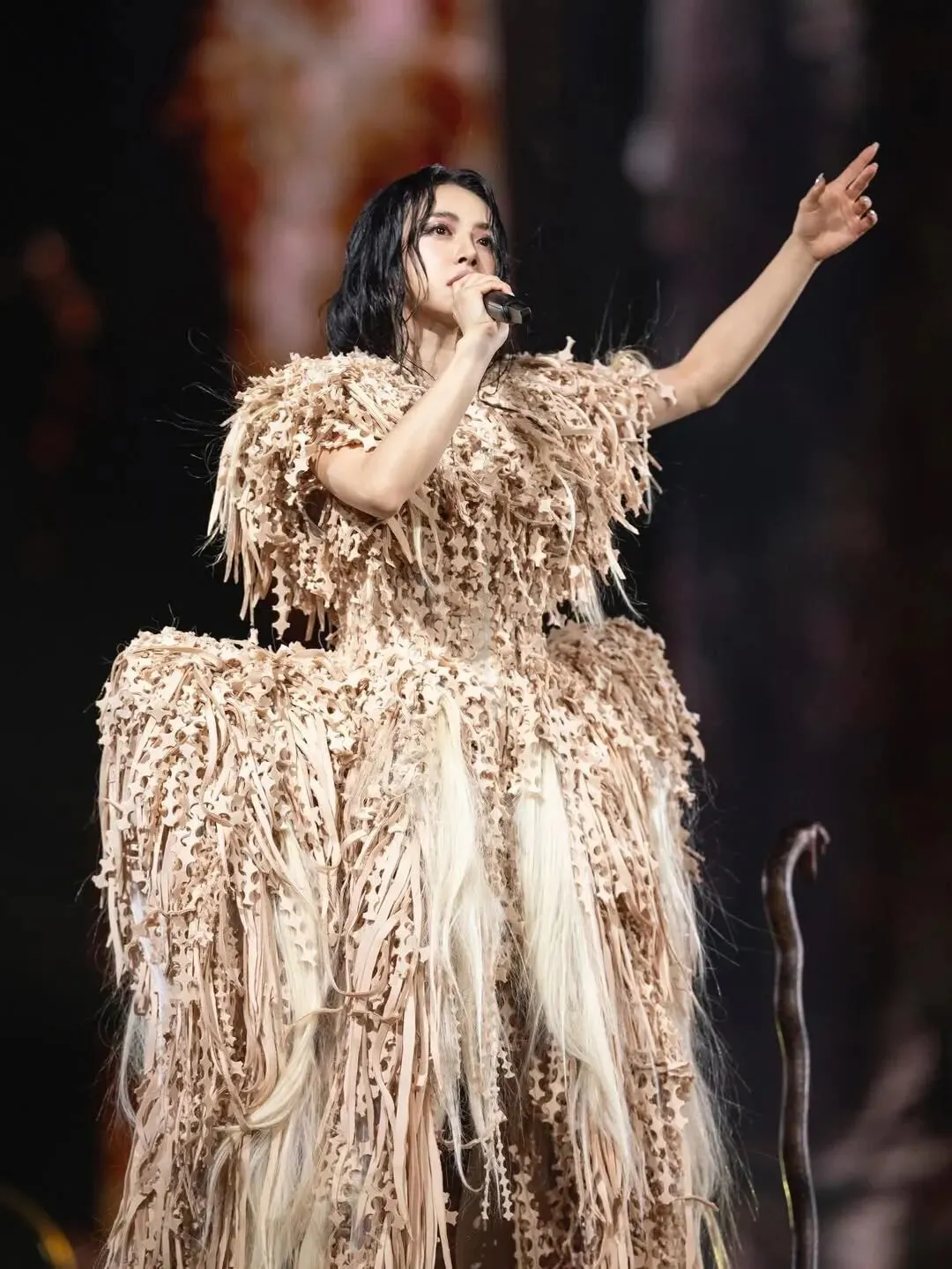 从“呸姐”到“愉悦之母”,蔡依林稳坐天后之位超20年。2025年末至2026元旦,她携《PLEASURE》世界巡演登陆台北大巨蛋,4万张门票秒空,微博热搜连挂3天。她斥资9亿台币打造“愉悦宇宙”,以五大章节串联六大奇幻场景,服装造型耗资5000万台币,舞群180套服装、200双鞋款撑起极致舞台,刷新亚洲单场制作费纪录。这场被赞“亚洲第一”的演唱会,从情歌到舞曲、从造型到舞台,处处藏惊喜,26年过去,她仍是华语乐坛无可替代的“地才神话”。演唱会以《PLEASURE》专辑为核心,通过“觉醒之巅”“欲望异域”“感官乐土”等六大场景,打造超现实艺术空间。舞台六大场景、五章故事,12组巨型装置可升降、旋转、喷火。1200只激光灯、480只音箱、8K LED地屏,36名舞者、24名乐手、120名工程人员,前后台总计480人。巨型欲望巨蟒、彩翼飞马、贪婪金猪等装置轮番登场,舞台如大型艺术展,连续三天霸屏社交媒体,被赞 “演唱会天花板”,四万观众嗨到失控,直言“像走进奇幻乐园”。从开场到终场,全程高能。演唱会以“大地精灵”造型登场,驾驭巨蟒绕场巡礼,瞬间点燃全场;随后化身“金纱女伶”“魔女莉莉丝”“幻境维纳斯”“魅欲女王”,七套造型对应五大章节,每一套都暗藏巧思。情歌与舞曲的沉浸式叙事,以《FISH LOVE》、《玫瑰少年》、《妥协》开篇,组曲《第三人称》、《天空》、《假装》、《柠檬草的味道》诉说爱情迷惘与成长。顶暗黑翅膀演绎《特务J》、《大艺术家》、《HOT WINTER》,舞者攀剑、蝴蝶海马巡游,舞台秒变狂欢派对。终场身披金色战袍站上“贪婪金猪”,以性感肢体诠释原欲本质,将金钱与感官刺激推向极致。5000万造型战袍,包括7套主角装对应五大章节,从“欲望守护者”到“魔女莉莉丝”,风格奇幻华丽。高规格的演出细节不只在主角蔡依林本身,还有与她搭配天衣无缝的舞群和乐手们,加总起来的服装造型就多达180套服装支撑舞台视觉,200双鞋款应对舞蹈强度,彩排变“试鞋大赛”,蔡依林更是首穿运动鞋登台,笑称“美梦成真”。Jolin这套造型开场,头戴“愉悦与苦痛”双面头盔,身披流苏打造的华丽外袍,肩线宽大,裙身具有强烈体积感。服装出自英国新锐品牌Maximilian Raynor,深受剧场、影视叙事与角色塑造启发,他将服装视为“角色的戏服”经常创造出具历史文化与前卫感的造型。由激光切割氯丁橡胶与毛发制成,宽肩裙身营造庞大体积感搭配MM6 Maison Margiela白色袜靴,气势开场。脱去Maximilian Raynor的订制外套后,Jolin里头穿着的是土耳其品牌 Dilara Findikoglu 的薄纱洋装,化身“大地精灵”骑乘巨蟒出场。Dilara Findikoglu是土耳其裔的英国设计师创立的同名品牌,擅长将哥德浪漫、锐利剪裁与女性主义思根的交织,鲜明的作品风格受到许多时髦女星喜爱!包括Rose、Rosalia、CharliXCX、Doia Cat等你爱的天后歌手都曾在红毯穿过她的前卫设计。这套设计为品牌2023春夏系列的改造款,整件衣服外层为透肤网纱,里层为鱼骨制成的胸衣,中间层为缠绕的发丝,和 Jolin 的湿发相互映衬,展现身材曲线之余,还带有暗黑浪漫气息。搭配运动鞋,兼顾舞台动作与舒适度,整体风格轻盈灵动,呼应歌曲《SEVEN》的歌德式史诗感。这双运动鞋也因此成为她出道24年来第一双登台运动鞋。画上暗色口红、身披黑色羽翼,Jolin这身“魔女莉莉丝”的皮革裤装来自纽约服装品牌ManMadeSkins,为品牌2026春夏系列延伸而来的特别订制。ManMadeSkins以使用素食皮革及另类材质著称,风格大胆前卫,这回为Jolin打造的暗黑风格裤装使用了大量的皮革及铆钉,并以紧身线条及镂空设计勾勒身材曲线。搭配Nihai高跟鞋,演唱《Bloody Mary》时,巨型“贪婪金猪”装置变身为“撒钞机”,吐出“愉悦纸钞”,营造原欲乐园氛围。在“真相之书”环节,Jolin 成为“金纱女伶”,身穿越南品牌LSOUL 2024春夏系列。造型以金色马甲搭配飘逸的薄纱,马甲、手套及长靴均融入绑带元素,卷曲长发增添浪漫俏皮感。来自越南的服装品牌LSOUL创立于2016年,以女性化但不失个性的设计为核心,甜辣的马甲风格和荷叶边短裙十分适合舞台造型,BLACKPINK演唱会也爱穿。由中国设计师Sensen Lii (李森森)创立的WINDOWSEN也为 Jolin此次演唱会打造名为”Colorful Butterfly 2.0″的造型,在 Jolin化身“幻境维纳斯”骑乘“彩翼飞马”时的出场。这套造型由可拆式设计的超大裙摆与连身衣组成,长达3米的裙摆上还以彩色印花呼应飞马身上的粉嫩色彩;卸掉裙摆后,为粉紫色的连身衣及紧身裤,除了缀满闪亮水钻,还有着如昆虫触须的有趣设计。Jolin身披七彩长裙,驾驭“彩翼飞马”登场,整体造型如人间乐园的国王。金色战袍以蛇纹与蛇形符号打造,象征最终升华。舞台七层楼高的八臂“愉悦之女”雕像与“蛇冠心座”“命运之轮”齐聚,将气氛推向高潮。身为Valentino品牌代言人Jolin在终场惊喜换上了创意总监Alessandro Michele特别为她订制的黑白色系造型。以透肤雪纺衬衫为基底,高领与蓬袖呈现宫廷感,叠加马甲式束身及荷叶边下身,外层黑色披风增添气势。搭配透肤丝袜及手套,发型为齐浏海黑长发。蔡依林要求凸显身材比例,整体造型融合浪漫与戏剧张力。从出道早期自称“地才”,到以“自虐式训练”出名,蔡依林从未因掌声变多而自满。面对质疑,她选择闭门苦练,用时间与成果说话。26年来,她为每一个舞台拼命练习,用行动定义“努力型艺人”的巅峰