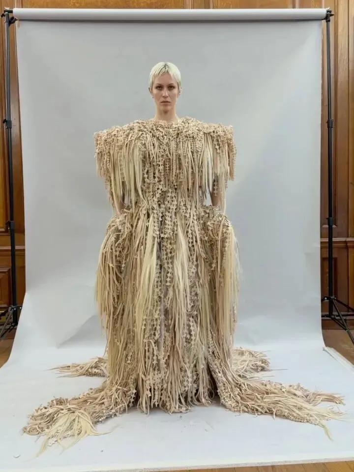 设计:激光切割氯丁橡胶与毛发制成的流苏外袍,宽肩裙身营造庞大体积感,搭配MM6 Maison Margiela白色袜靴。头戴“愉悦与苦痛”双面头盔,象征专辑核心概念。