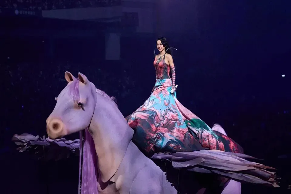 2025年末至2026年元旦期间,蔡依林携《PLEASURE》世界巡演登陆台北大巨蛋,连开三场,4万张门票秒空,微博热搜连挂3天,创下亚洲单场演唱会制作费纪录。这场总投资达9亿台币的“愉悦宇宙”演唱会,以五大章节串联六大奇幻场景,融合顶尖舞美、服装设计与沉浸式叙事,被赞为“亚洲第一演唱会”和“演唱会天花板”。