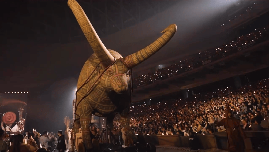 传统文化意象:开场巨蟒融入中国神话女娲灵蛇意象,在生肖蛇年背景下实现中西神话对话。“剑丛”装置首次将中国传统杂技“爬竿”搬上演唱会舞台,由江苏溧阳特技团队历时五个月封闭集训完成。