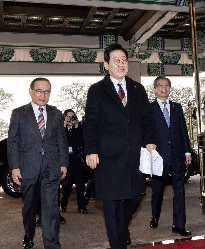 红毯之上,阳光正好,李在明身着高级灰正装,身姿挺拔,笑容亲和;身旁的金惠景一袭白色长款大衣,光腿出镜,身姿温婉,珍珠耳环在阳光下熠熠生辉,两人相视一笑间,尽是岁月沉淀的默契与深情。
