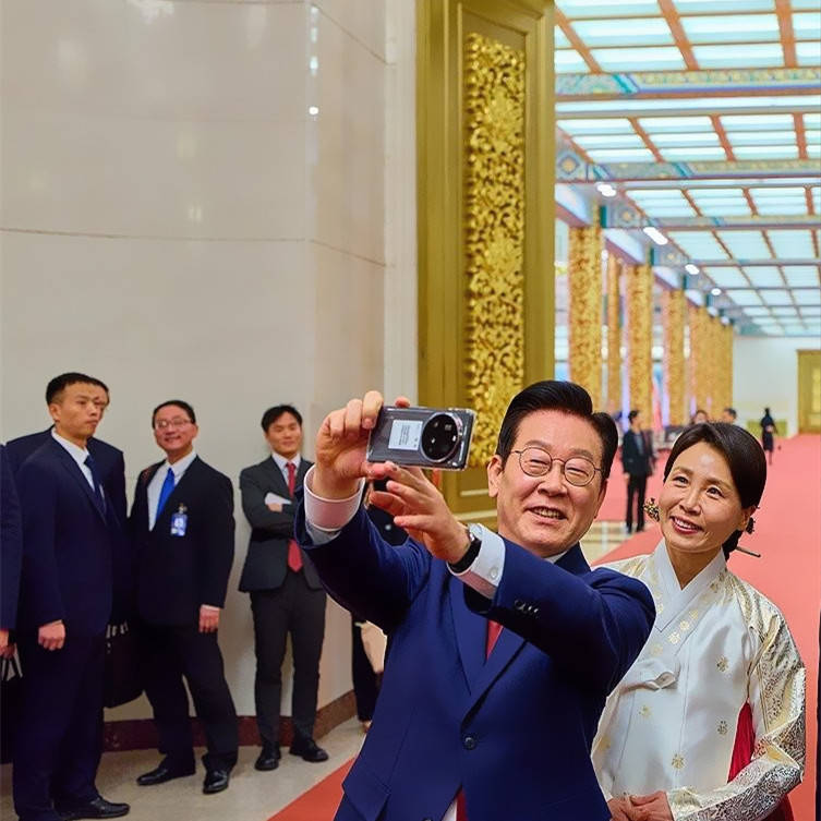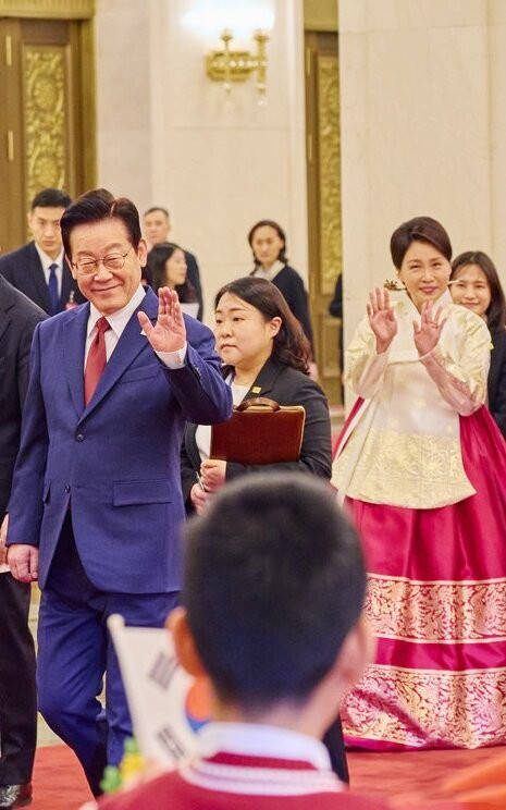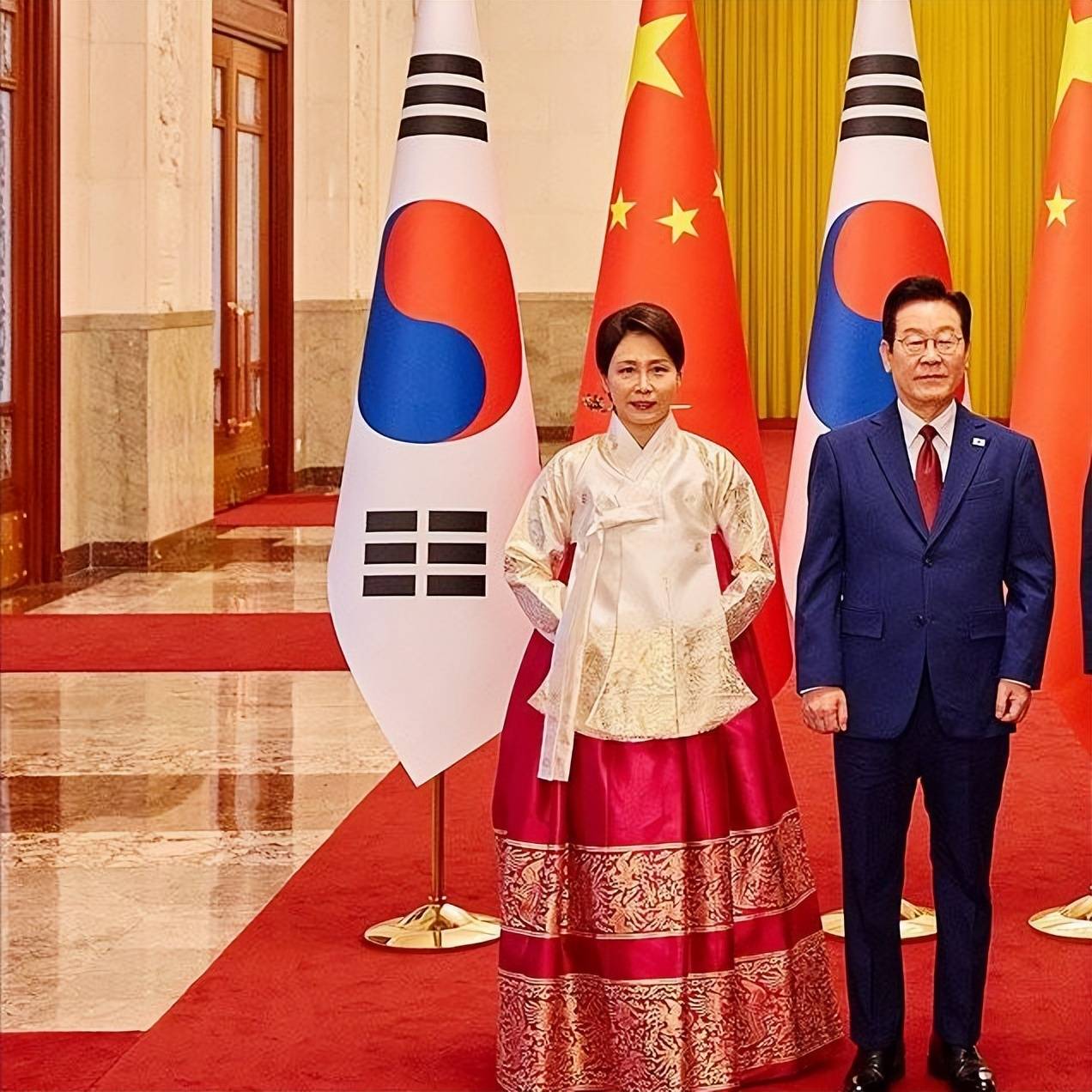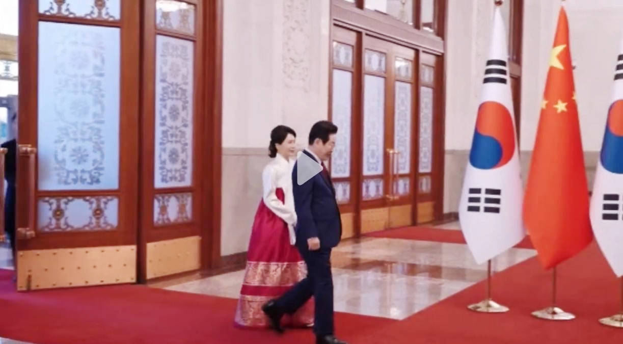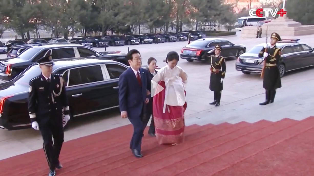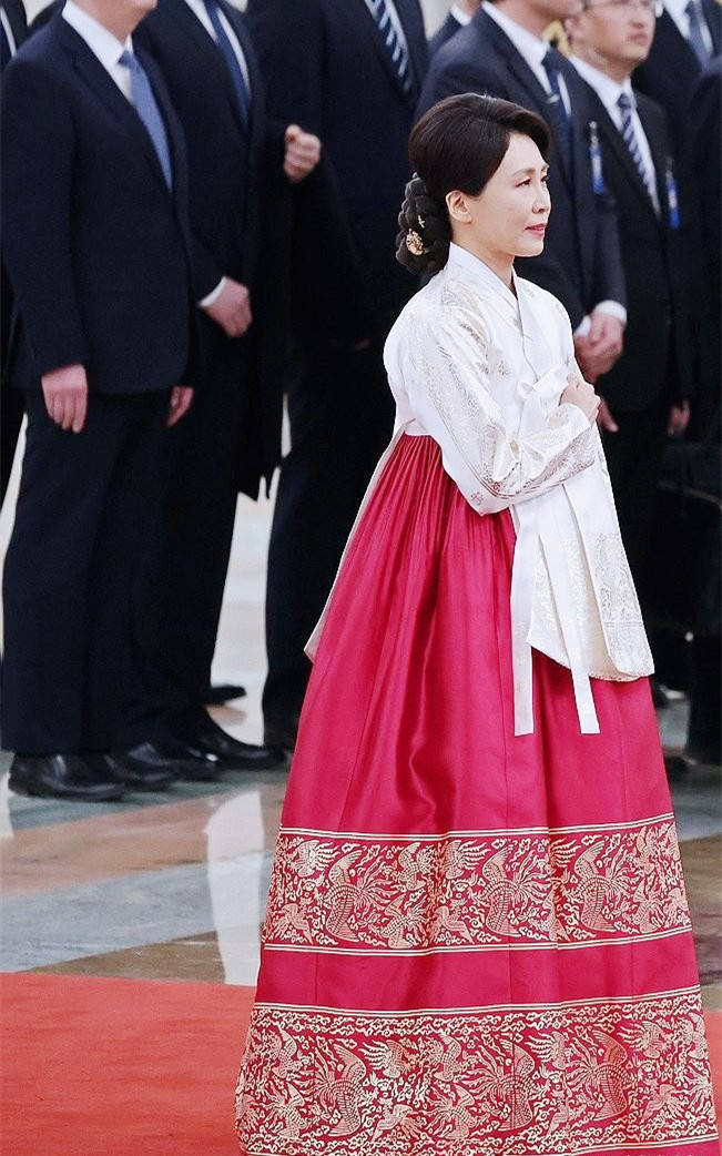 1月5日的人民大会堂前,红毯铺展,仪仗肃立,李在明身着高定西服,一条中国红领带点缀其间,尽显绅士儒雅,昂首前行时自带沉稳气场;身旁的金惠景则身着白衫红裙的传统韩服,一手轻挽丈夫胳膊,一手轻拎裙摆,步履轻缓却身姿端庄。