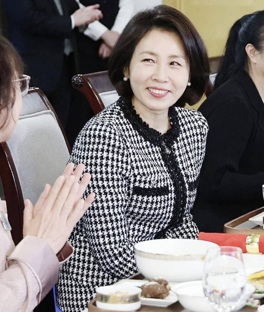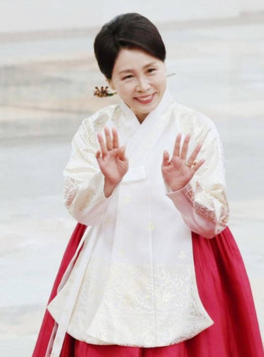从宝蓝大衣的端庄干练到红白韩服的惊艳华贵,从千鸟格套装的时尚精致到传统服饰的古韵流转,每一套穿搭都藏着审美巧思,更映照着她与李在明相伴数十载的深情。