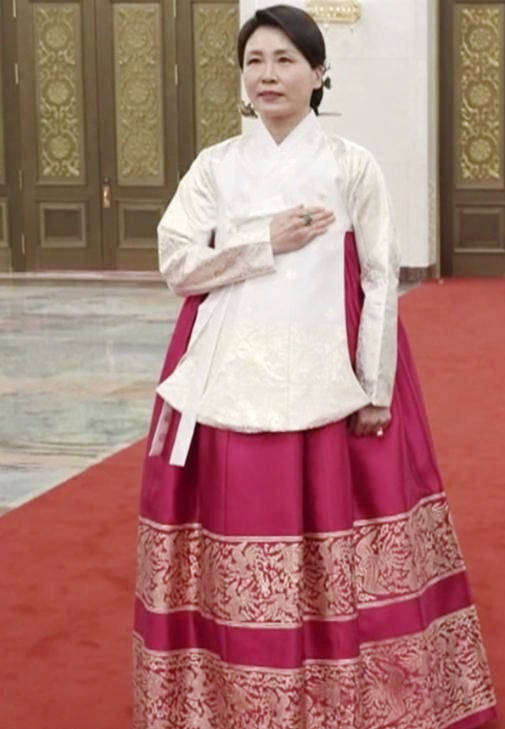 她在人民大会堂欢迎仪式上穿的红白韩服,最能体现这种交融之美。上衣为白色短衫,衣襟交错的佑衽设计,与中式汉服的交领形制有着异曲同工之妙,尽显东方服饰的典雅韵味;