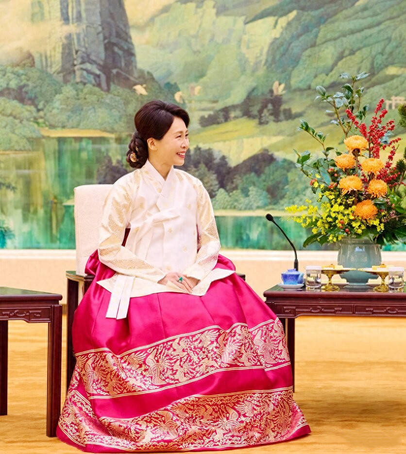金惠景的访华之行,最令人瞩目的莫过于她多套极具特色的韩服穿搭。韩服作为韩国传统文化的重要载体,历史可追溯至公元前3世纪的三国时期,深受中国汉服影响,却又在岁月流转中形成了独特风格。金惠景的韩服造型,既藏着与中式服饰的渊源之美,又彰显着韩式服饰的鲜明特色,每一次亮相都让人眼前一亮。