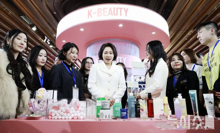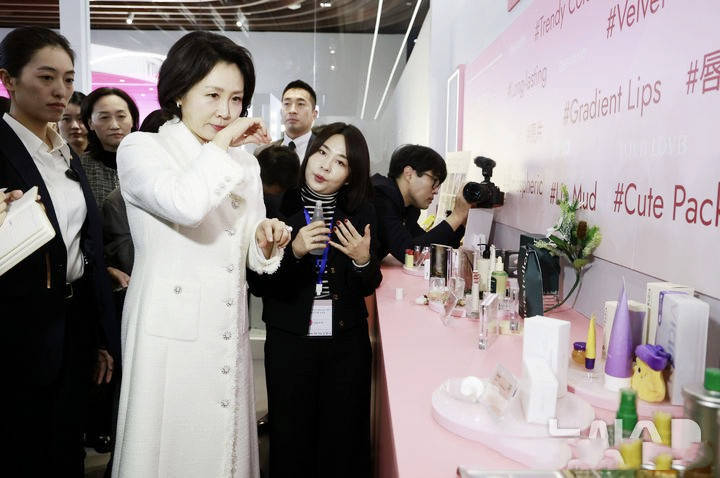 金惠景在现场表示:“这些韩妆品牌积极回应市场需求,具有充分的多样性和独特的个性风格,我期待韩中美妆产业多交流、多合作。”这番话语与她的穿搭风格相得益彰,都传递着开放、友好的态度,让白色大衣成为中韩美妆交流的温情载体。