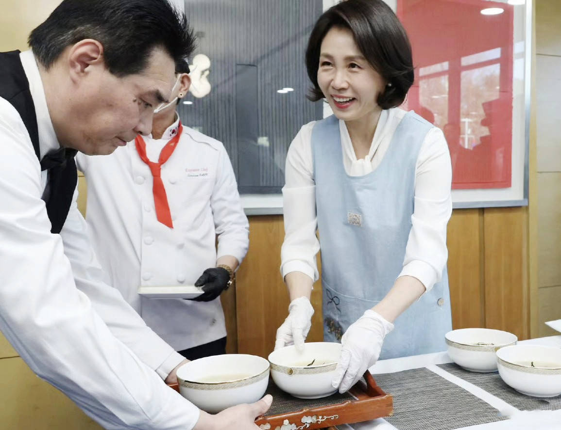 访华期间,她亲自下厨,在北京的韩国大使馆为中国各界优秀女性烹制自创的饺子年糕汤。这道菜肴融合了韩国新年传统的年糕汤与中国春节特色的饺子,寓意着中韩友谊长存。