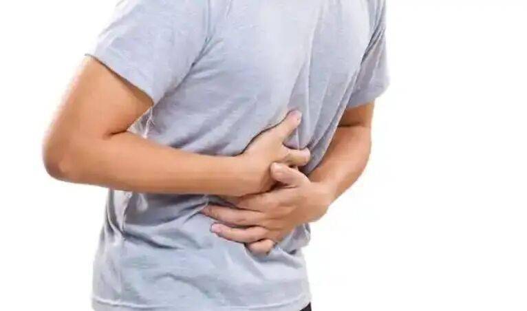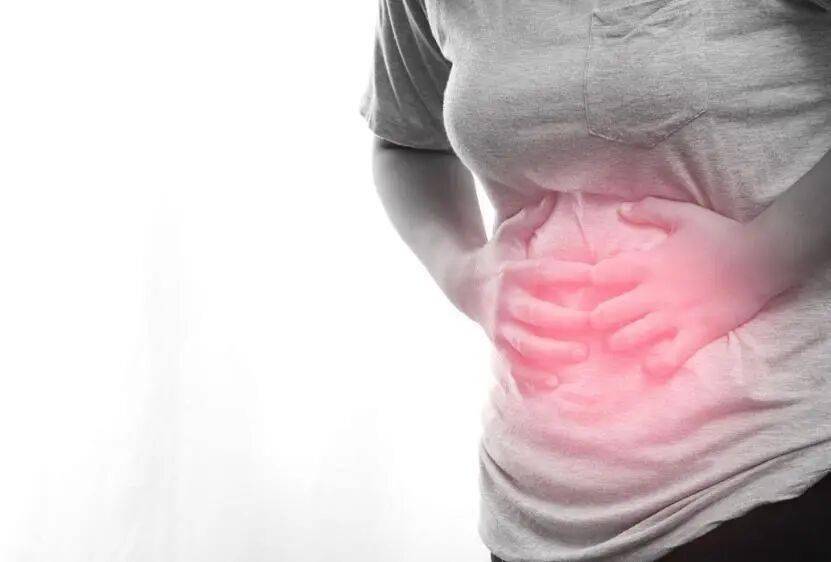 内容:穿灰色上衣的人双手放腹部,腹部区域红色高亮显示。