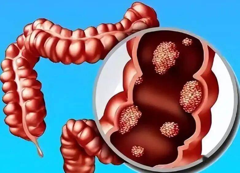 内容:人体肠道示意图,红色肠道部分区域放大,显示内壁凸起瘤状物体。