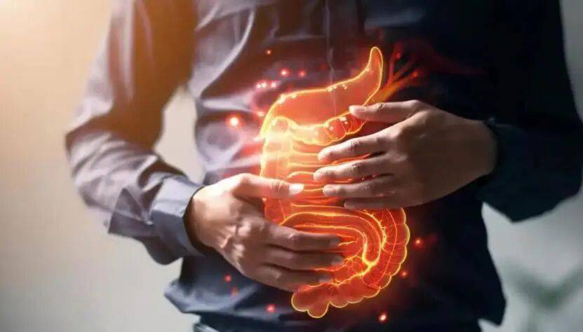 内容:穿深色衣服的人双手放腹部,腹部有肠道发光图案。