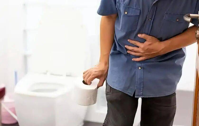 内容:穿蓝色衬衫和深色裤子的人右手拿卫生纸,左手放腹部,背景有白色马桶。