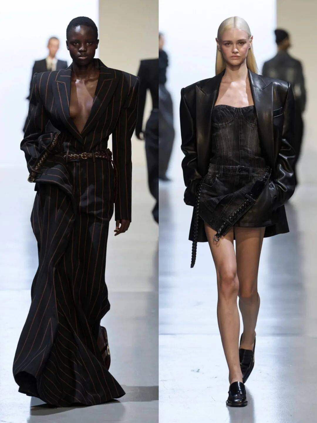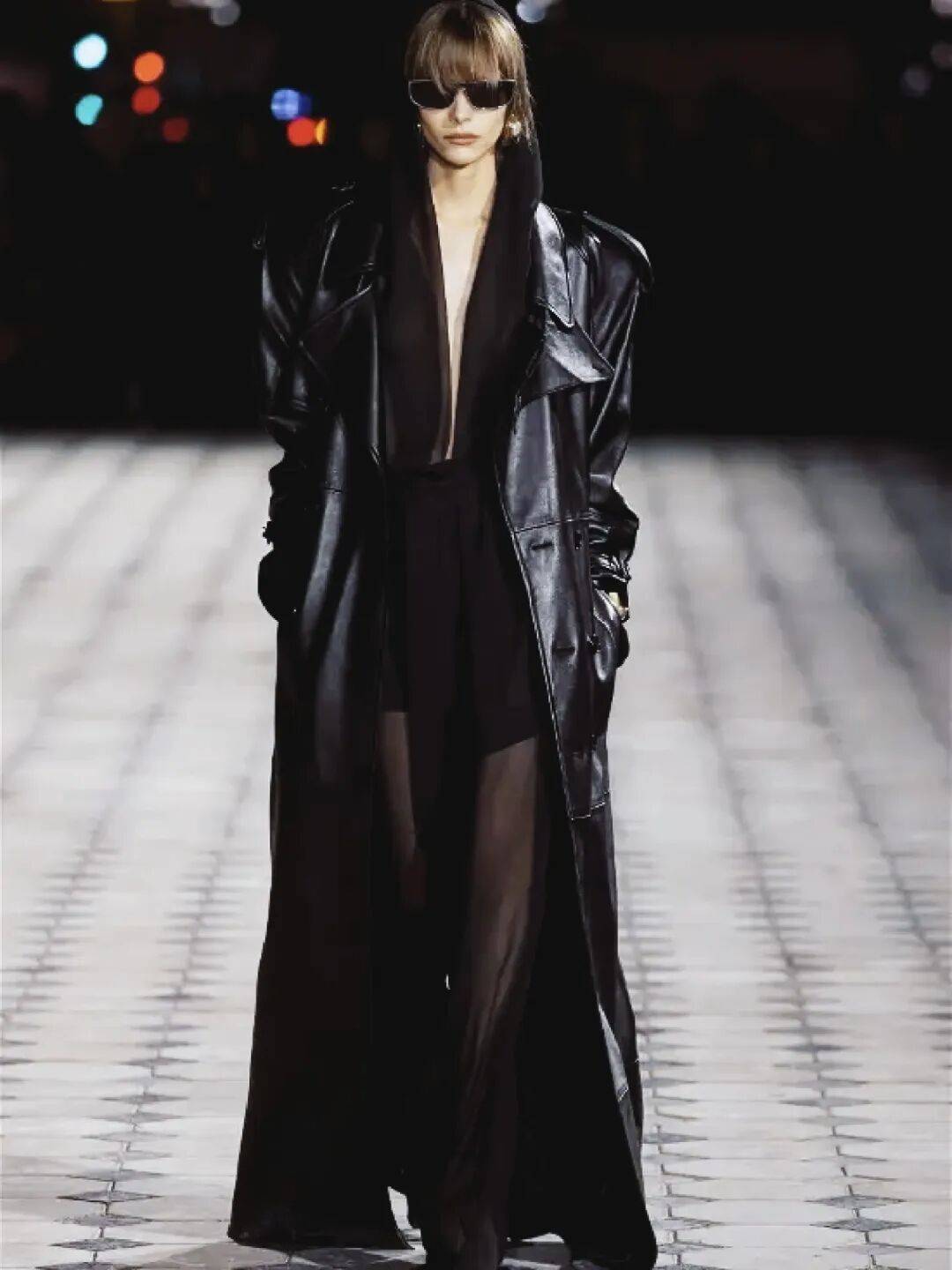 不同材质的黑色叠穿(皮革、丝绸、针织)营造层次感。搭配皮革长裤,蕾丝内衬从硬挺西装里微露——这种冲突感搭配正是精髓所在,暗示复杂多面的性格。